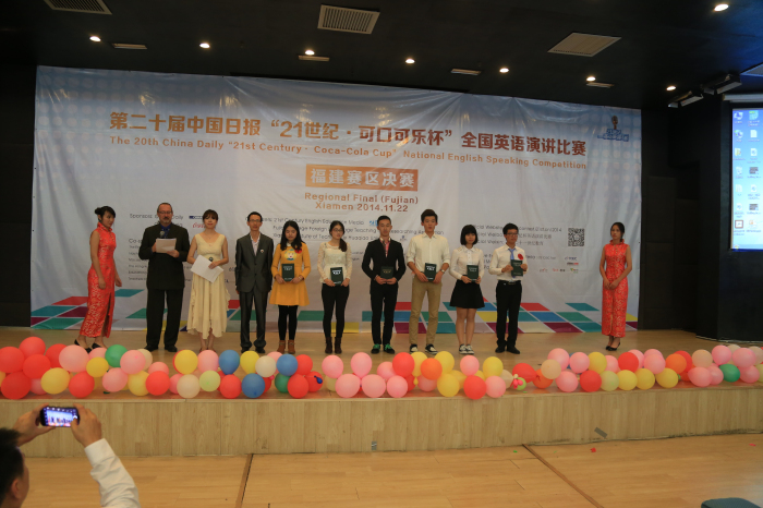 本次中国日报社“21世纪.可口可乐杯”全国英语演讲比赛福建赛区决赛,我校领导高度重视,外语教研室周密安排,学校相关部门,校英语协会的同学通力协作、精心组织,工作人员和志愿者辛勤工作,全校师生以饱满的热情迎接来自省内高校的嘉宾、评委和选手,确保了大赛成功举办,展示了学校良好形象,受到大会组委会和参赛师生的高度好评。闭幕式上,我校荣获组委会颁发的优秀组织单位。(文/英语教学系 图/记者团吴玉婷)