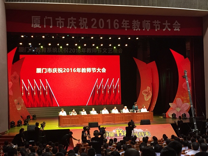 9月9日晚,厦门市庆祝2016年教师节大会在市人民会堂隆重举行。厦门工学院董事长李德文先生、副校长田晓皋、附属学校校长赵继容应邀出席。