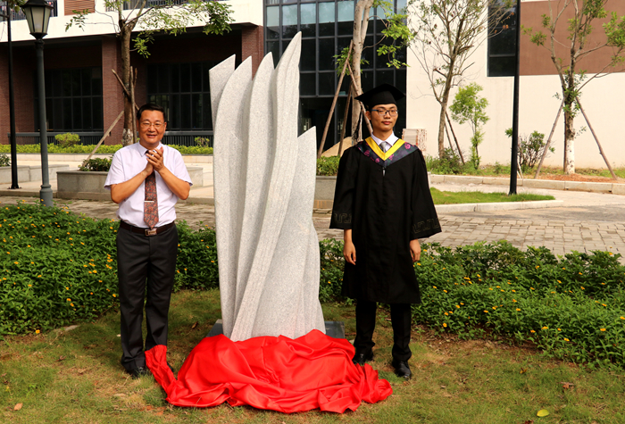 蔡远利校长与2017届毕业生代表张祖铭共同为2017届毕业生捐赠雕塑揭牌。