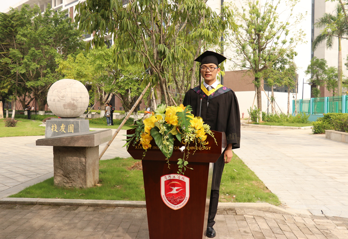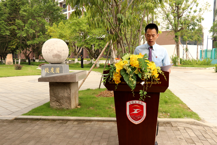 2017届毕业生代表张祖铭发言。他表示,饮水思源,学成念师,此次捐赠雕像是由2017届毕业生自愿捐赠的,目的是表达对母校的感恩之情,对师生情和同学情的怀念,同时也是倡导厦工学子“一路感恩,一路前行”。