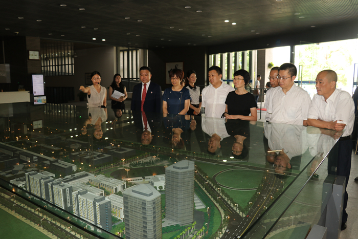 黄华红副行长(左四)在李雄虎副校长(左三)陪同下参观学校沙盘