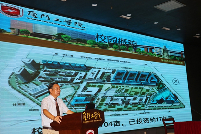 仪式上,蔡远利校长作了题为“厦工的历史与文化——认识厦工、熟悉厦工、归属厦工”的发言。他从学校概况、认识校园、领导架构、学校文化、发展规划五个方面对厦门工学院的历史与文化进行了介绍。蔡校长表示,人生因梦想而精彩,梦想因拼搏而绚烂,成功之花因汗水而怒放,生命之树因梦想而常青,厦门工学院是我们共同的家园,希望大家在厦工放飞梦想,成就人生!