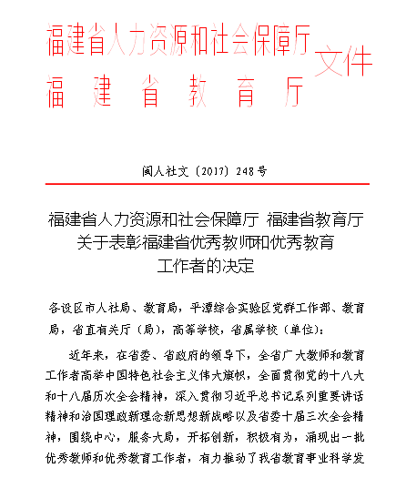 日前,福建省人力资源和社会保障厅、福建省教育厅联合印发了《关于表彰福建省优秀教师和优秀教育工作者的决定》(闽人社文〔2017〕248号),公布了2015-2017年度福建省优秀教师。厦门工学院邱能生老师荣获“福建省优秀教师”称号。