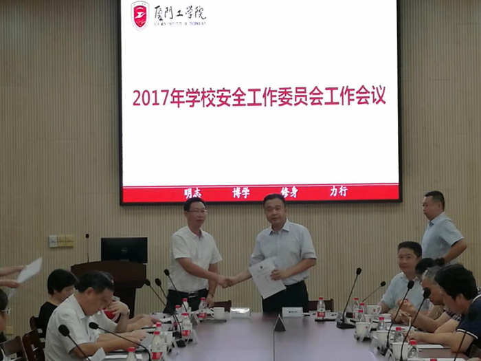 9月19日下午,厦门工学院2016-2017安全工作委员会会议在我校图书馆会议室召开。校长蔡远利,执行董事、副校长李雄虎,副校长陈少牧、田晓皋、冯良贵、苏涵出席会议,各二级学院、书院、部门及直属单位领导参加会议。会议由安全处处长李洪杰主持。