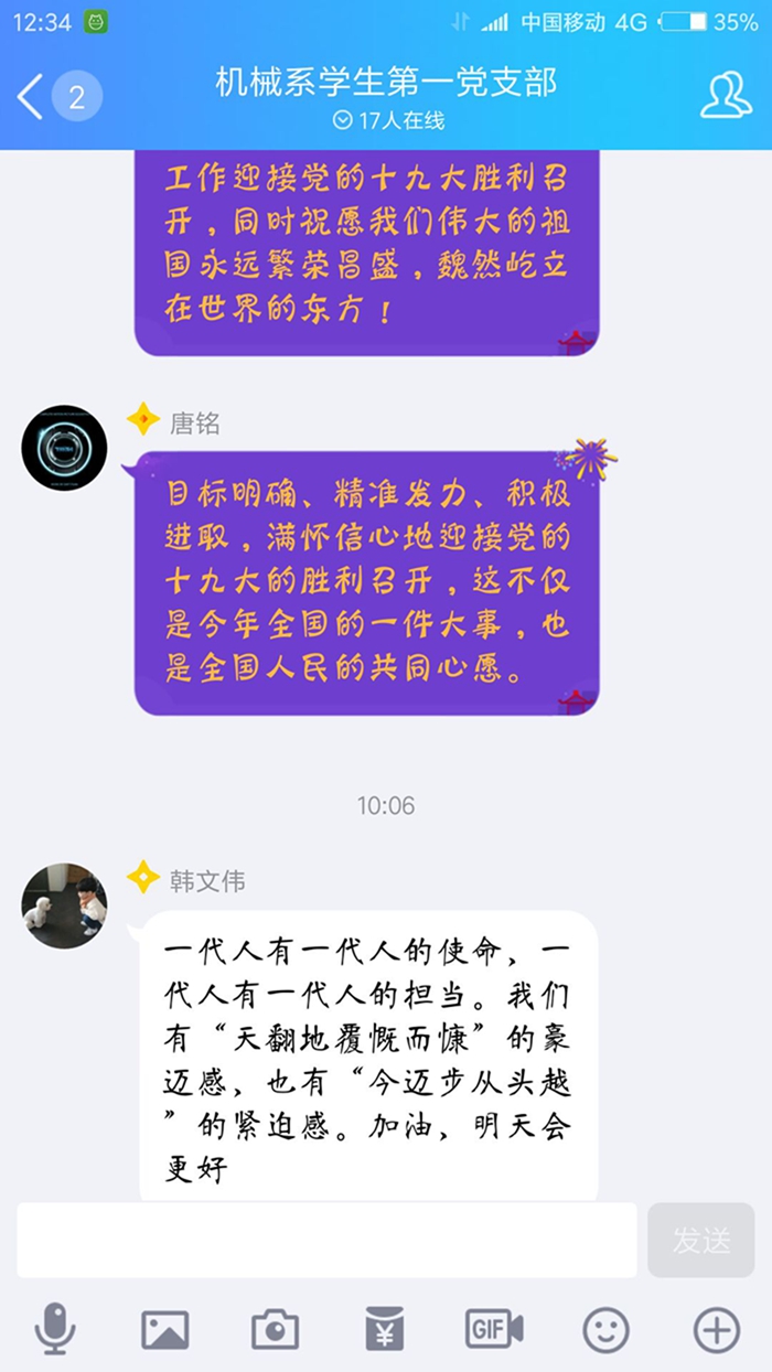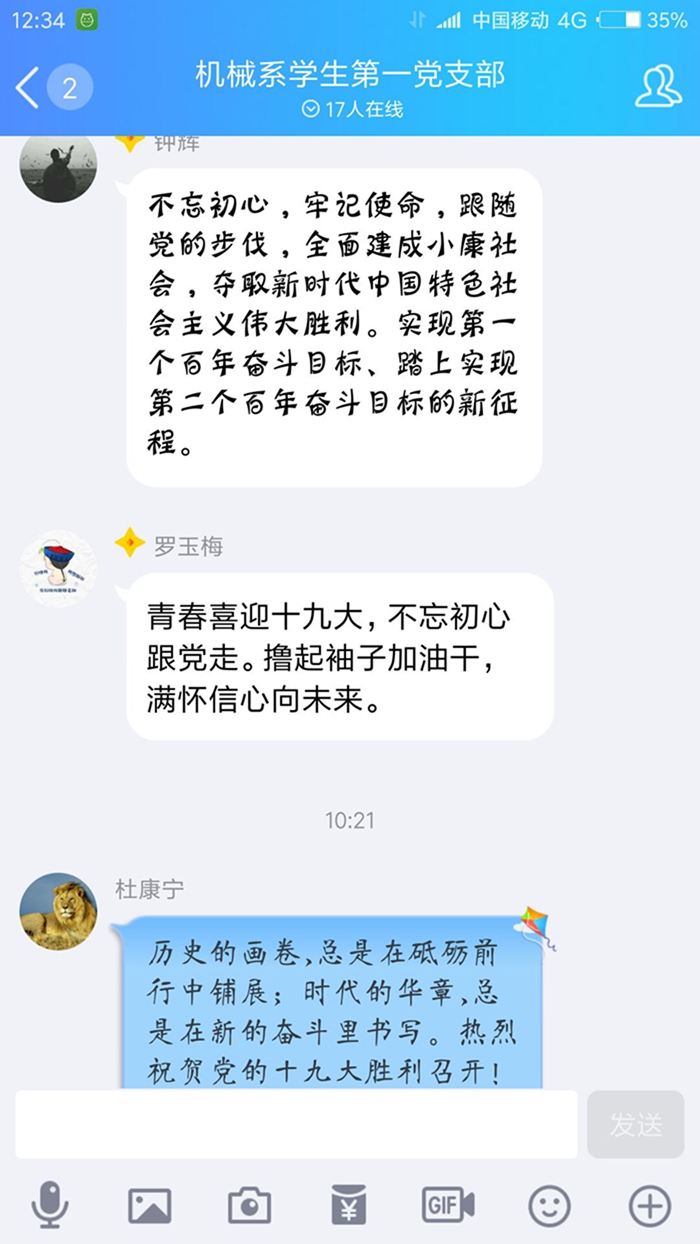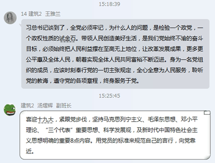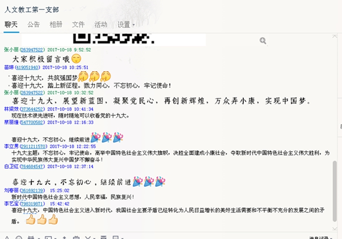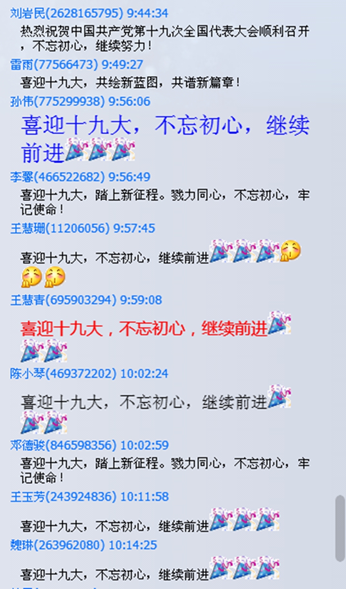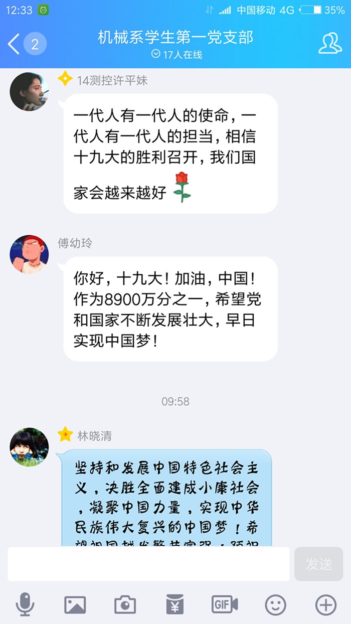 同时,我校广大师生党员对习近平总书记的报告反响热烈,对报告中所提到的成绩深受鼓舞、对报告描绘的发展蓝图充满期待,广大师生党员纷纷通过厦工党建群、支部党建群等渠道踊跃发言,表达对党的十九大胜利召开的衷心寄语,以及对祖国未来繁荣昌盛的美好祝福。