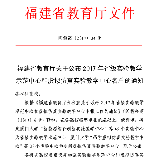 据悉,福建省省级实验教学中心是根据《福建省教育厅办公室关于做好2017年省级实验教学示范中心和虚拟仿真实验教学中心申报工作的通知》(闽教办高〔2017〕6号)的精神,在各高校推荐申报的基础上,经评审确定出49个实验中心为省级实验教学示范中心。