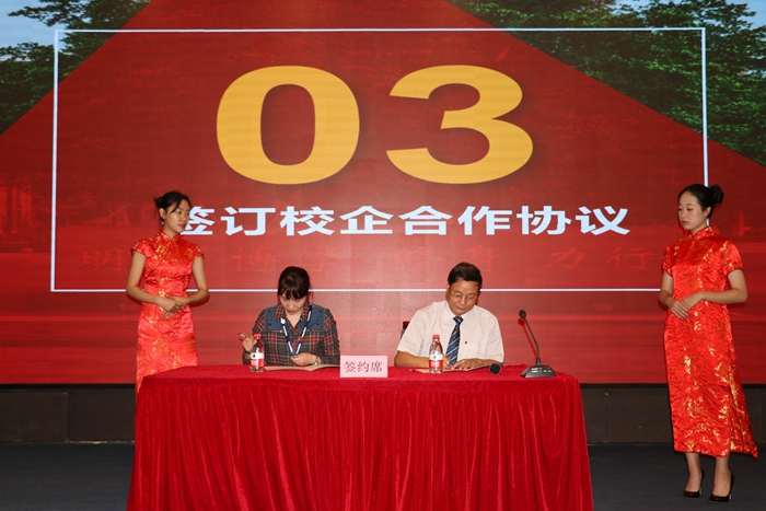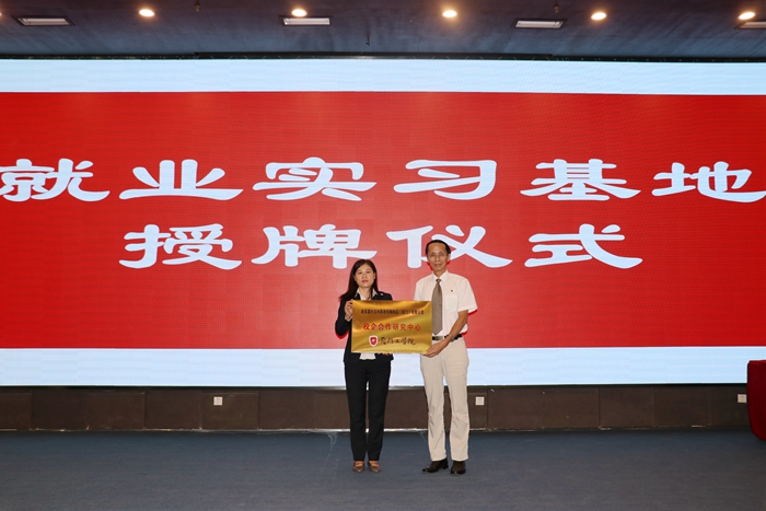 陈少牧副校长授予企业“大学生实习与就业基地”牌匾,企业向学校授予“校企合作研究中心”牌匾。