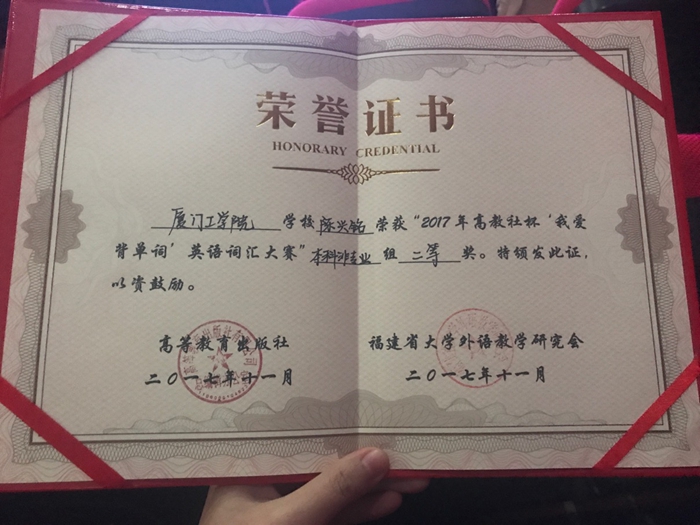 在11月19日上午举行的本科非专业组竞赛中,我校16级软件专业的陈兴铭同学和16级投资专业的沈益同学表现优异,以优异成绩分别获得福建省二等奖和三等奖。外语系教师宋榕榕和邱能生分获指导教师二等奖和三等奖。