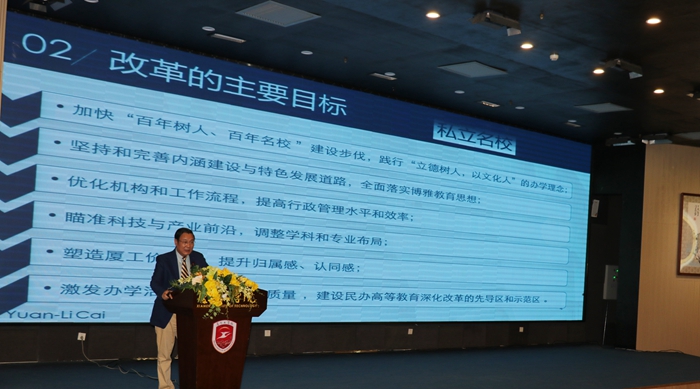 首先,蔡远利校长介绍了本次改革的背景和动因。蔡校长重点介绍了本次改革的目标,他认为通过本次改革,将加快厦门工学院“百年树人、百年名校”建设步伐,践行“立德树人,以文化人”的办学理念;坚持和完善内涵建设与特色发展道路,全面落实博雅教育精神;通过优化机构和工作流程,提高行政管理水平和效率;瞄准科技与产业前沿,调整学科与产业布局,通过塑造厦门工学院价值观,提升广大师生的归属感;进一步激发办学活力,提高办学质量,建设民办高等教育深化改革的先导区和示范区。