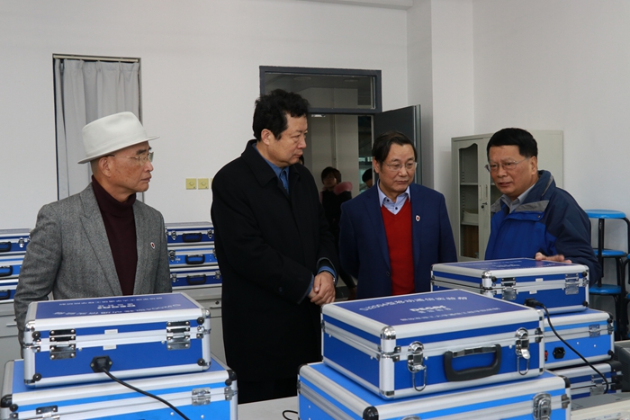 我校双聘院士蒋庄德教授(左二)走访我校电子与电气工程学院省级电工电子教学示范中心并指导工作
