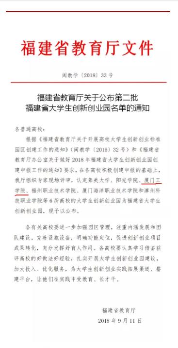 根据《福建省教育厅关于开展高校大学生创新创业标准园区创建工作的通知》(闽教学〔2016〕32号)和《福建省教育厅办公室关于做好2018年福建省大学生创新创业园创建申报工作的通知》要求,在各高校积极创建申报的基础上,福建省组织专家现场评审,认定包括集美大学、阳光学院、厦门工学院、福州职业技术学院、厦门海洋职业技术学院和漳州科技职业学院等6所高校的大学生创新创业园为福建省大学生创新创业园。