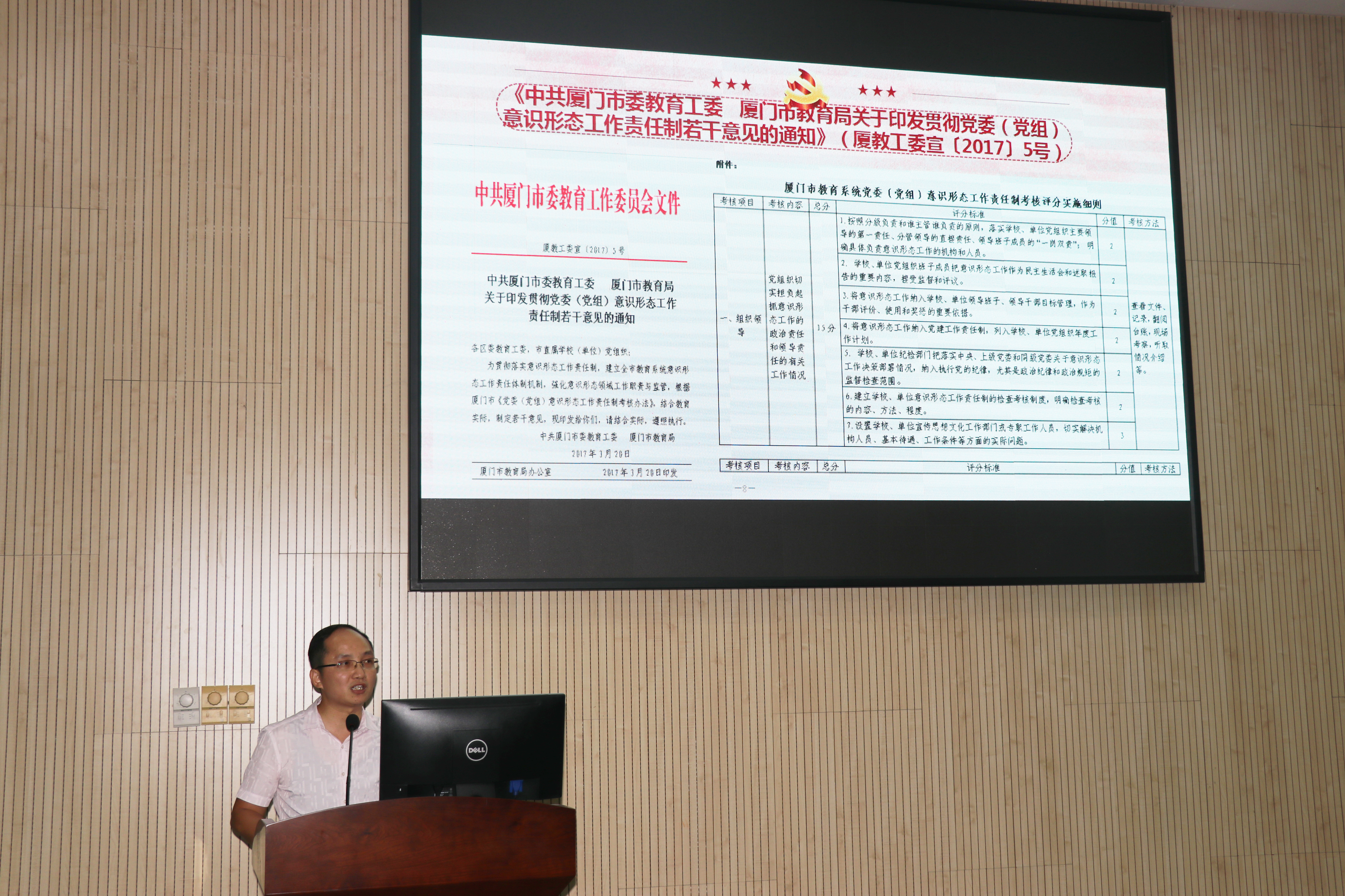 随后,党办副主任林建森,对《中共厦门市委教育工委 厦门市教育局关于印发贯彻党委(党组)意识形态工作责任制若干意见的通知》(厦教工委宣〔2017〕5号)和《中共厦门市委教育工委关于做好2018年度落实党委意识形态责任制情况检查考核工作的通知》(厦教工委宣〔2018〕19号)两份文件内容,进行了再学习再强调再解读,并部署了近期学校意识形态领域的工作。