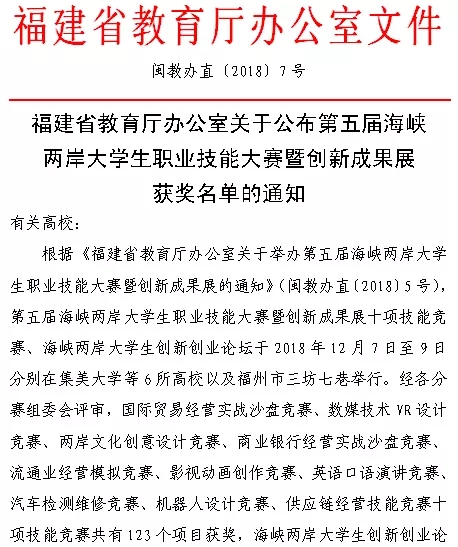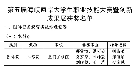 近日,福建省教育厅公布第五届海峡两岸大学生职业技能大赛暨创新成果展获奖名单,其中我校一支团队荣获国际贸易经营实战沙盘竞赛本科组二等奖!