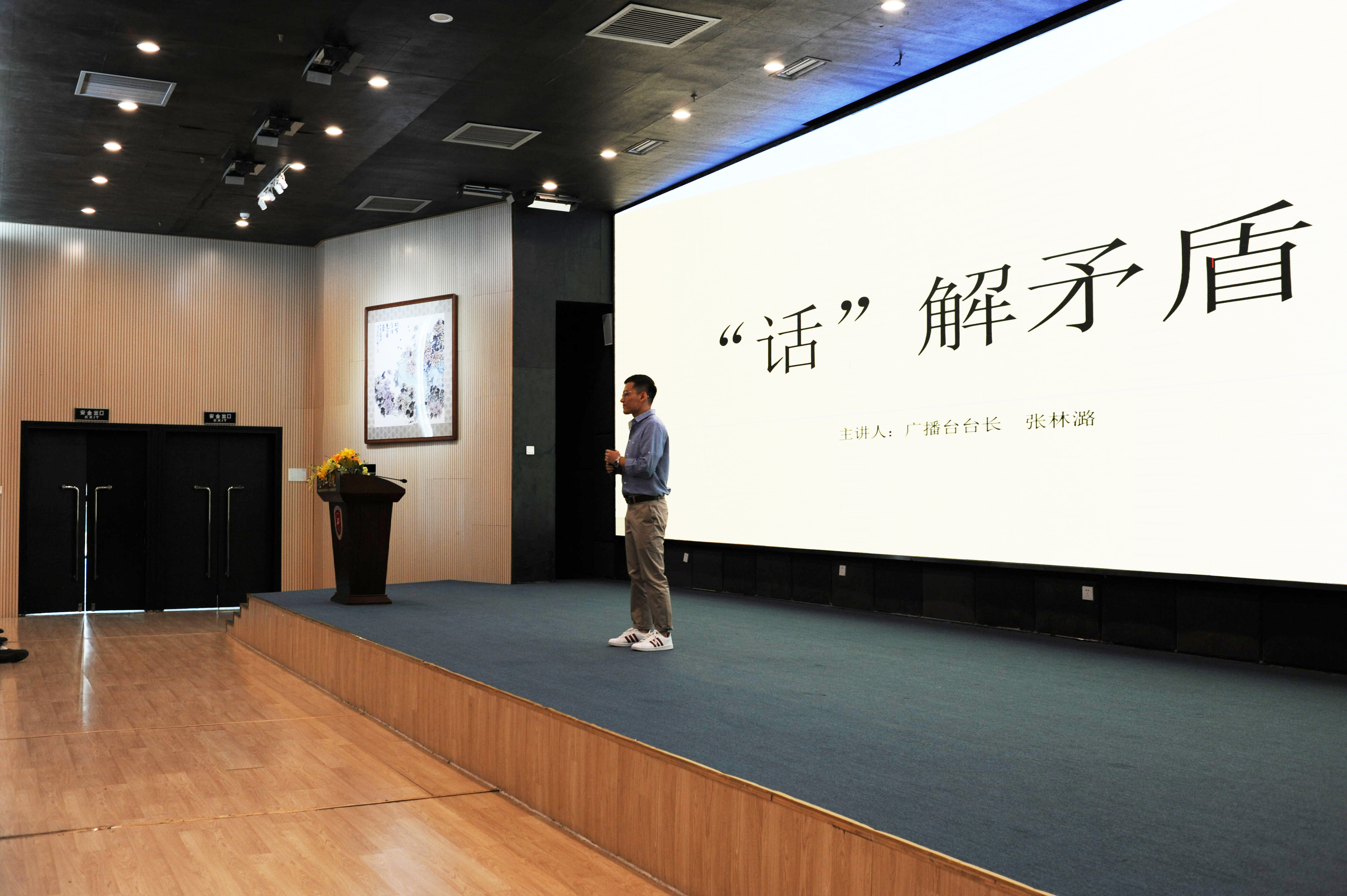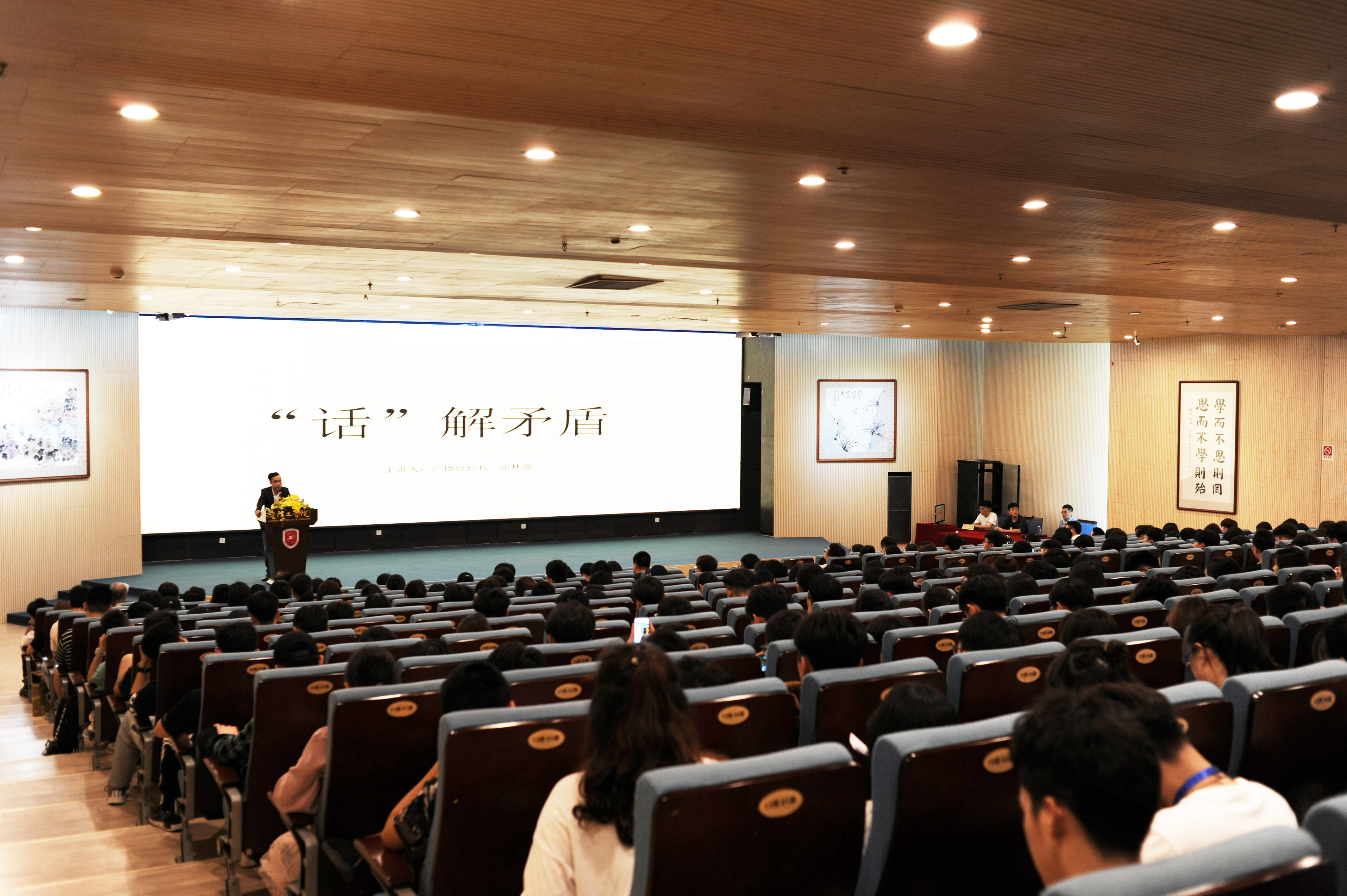 今天,德文大学堂暨通识教育实验班首堂课主讲人是校广播台台长张林潞同学,授课《“话”解矛盾》,出席的领导、老师和近500名学生干部代表在台下作为学生认真倾听和互动交流了张林潞同学的分享讲座,活动全程1个小时左右,全场自发响起7次掌声,5名同学与主讲人进行了现场互动问答。