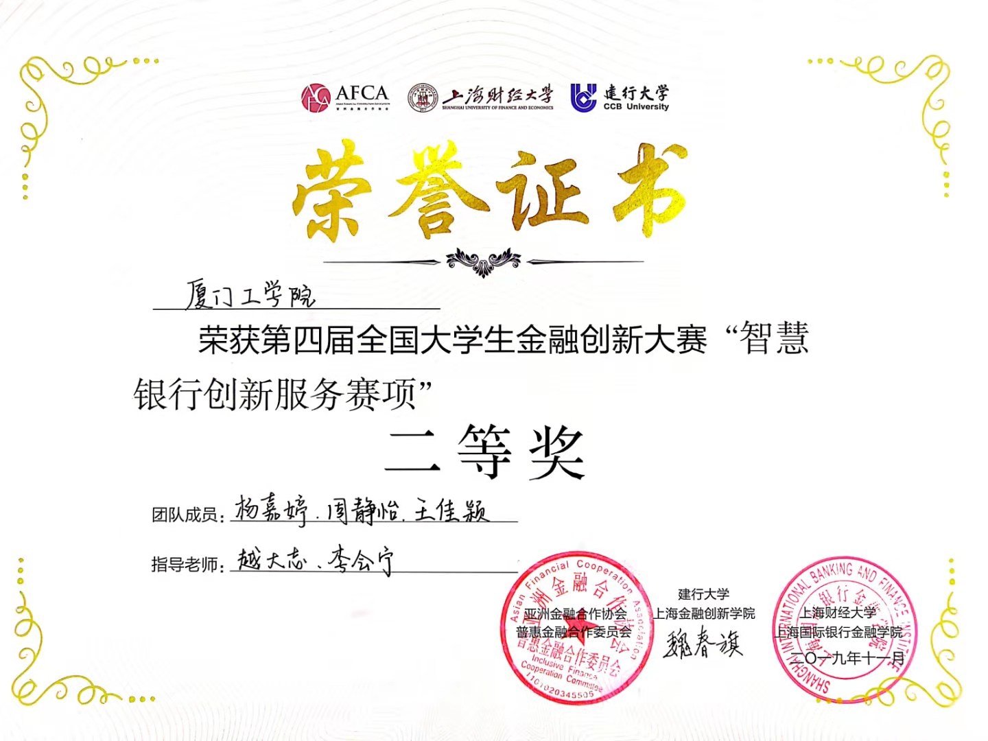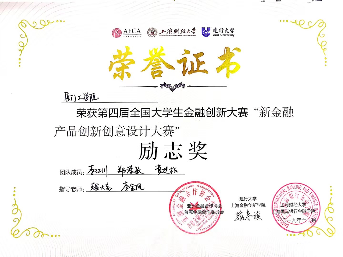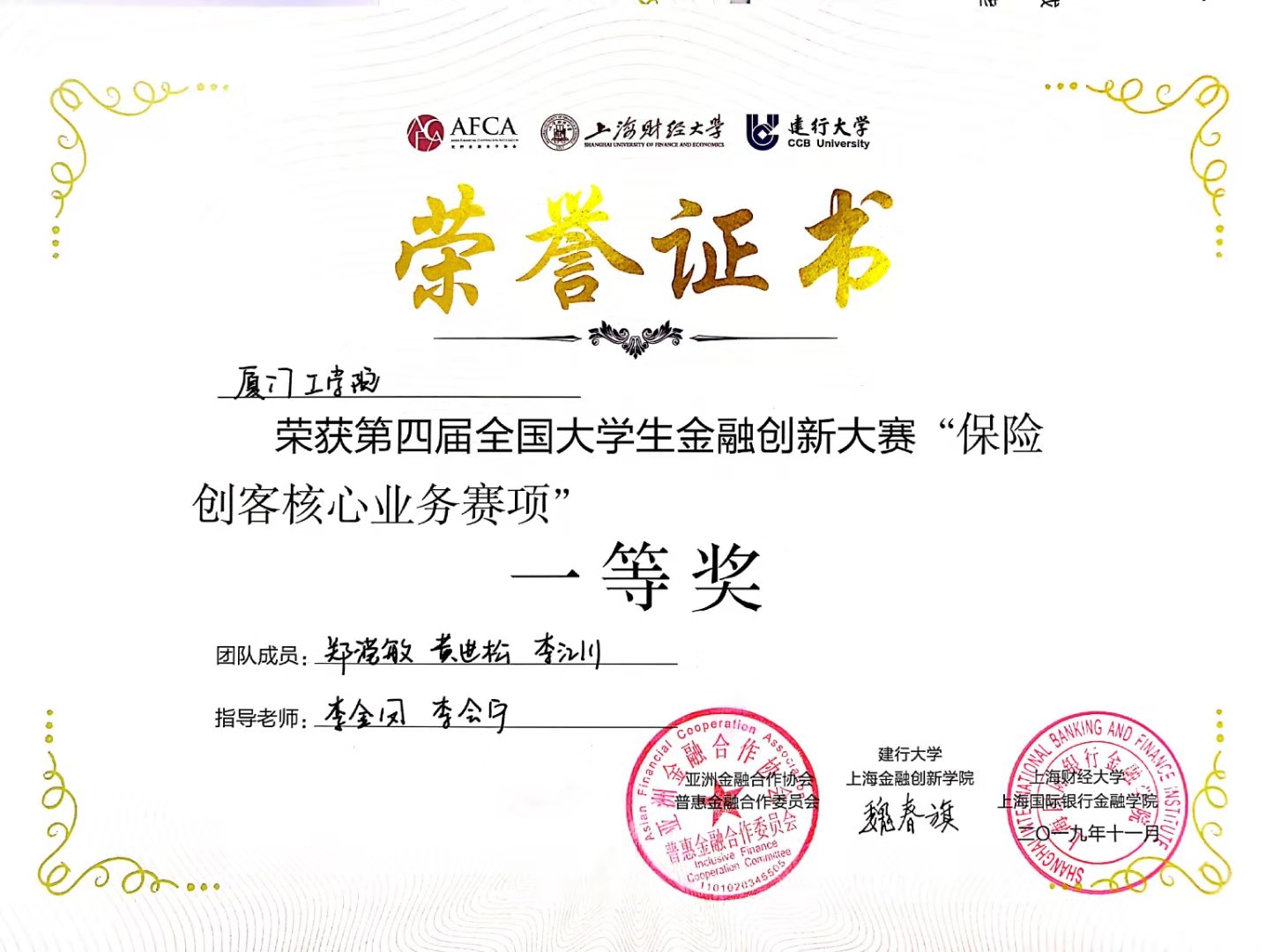 商学院投资学专业学生代表我校参赛并包揽所有奖项,郑滢敏、黄进松、李江川荣获“保险创客核心业务赛项”团体一等奖;杨嘉婷、周静怡、王佳颖荣获“智慧银行创新服务赛项”团体二等奖;李坤媛、杨鑫钰、孙玲玲荣获“互联网金融创新与运营管理大赛”团体二等奖;林滢、蓝梦婷、卫慧斐荣获“理财规划-明日之星赛项”团体三等奖,林滢、蓝梦婷分别获得“理财规划-明日之星赛项”个人优胜奖;李江川、郑滢敏、黄进松荣获“新金融产品创新创意设计大赛”励志奖。