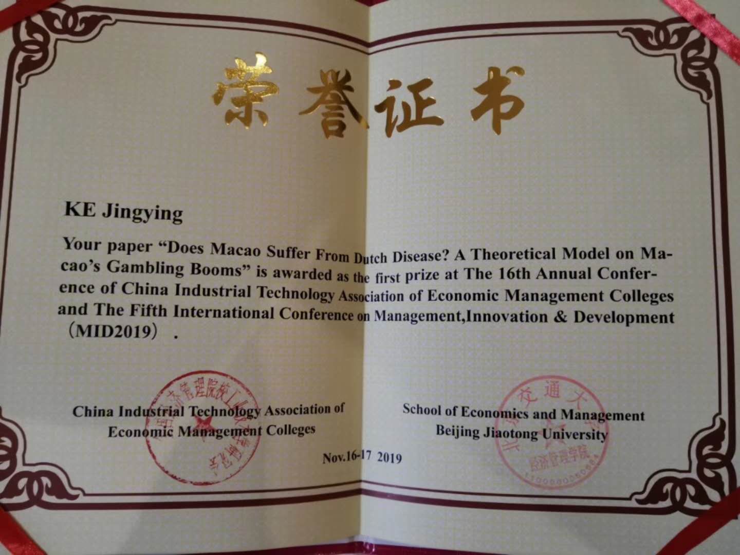 16日下午,大会举行工商管理(校长/院长)论坛、研究会发展研讨和MID2019优秀论文交流专题论坛。商学院副院长柯晶莹在MID2019优秀论文交流专题论坛中,做了《Does Macao Suffer From Dutch Disease? A Theoretical Model on Macao’s Gambling Booms》的论文报告,论文得到会议专家委员会的高度认可并获得“一等奖”。