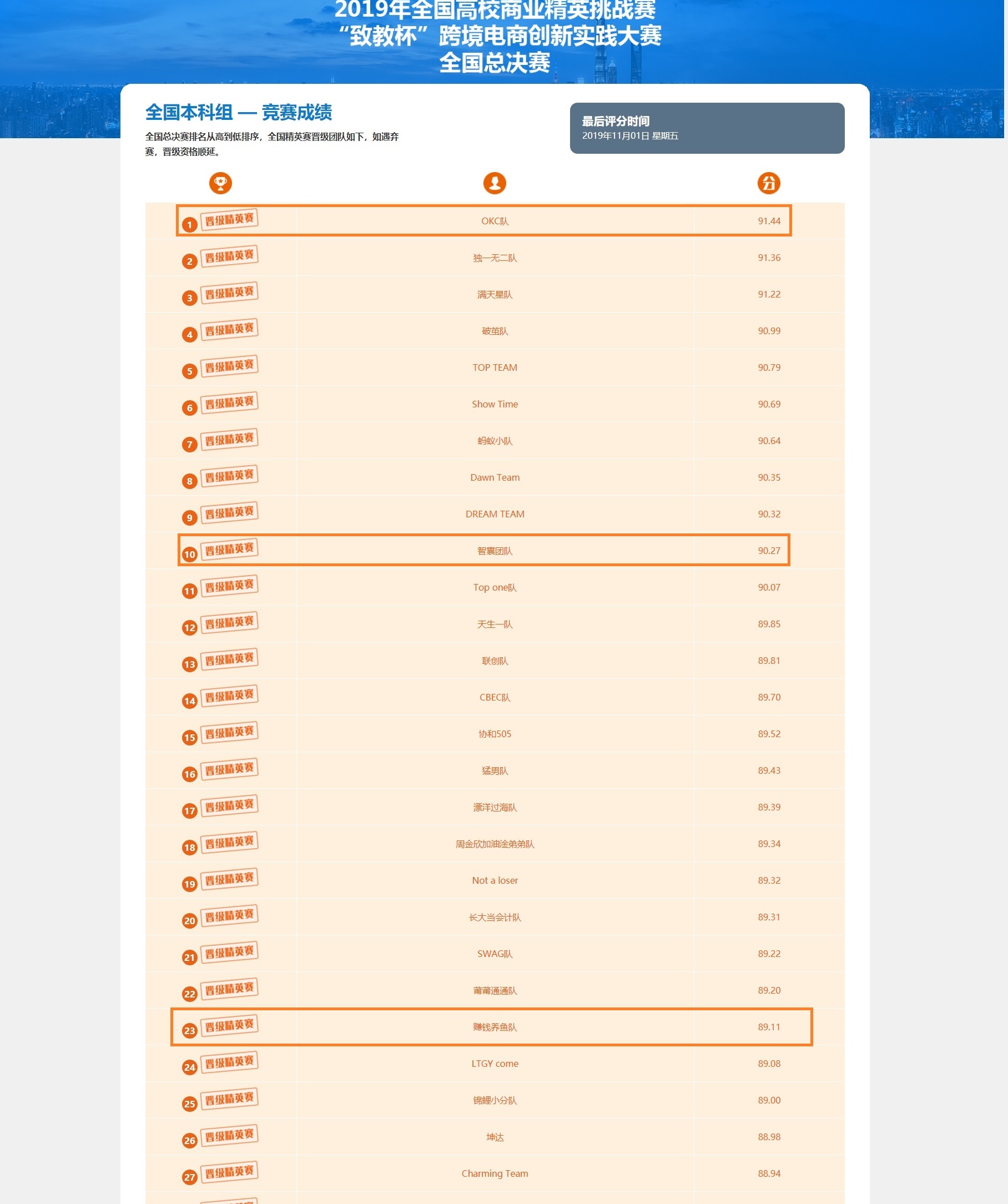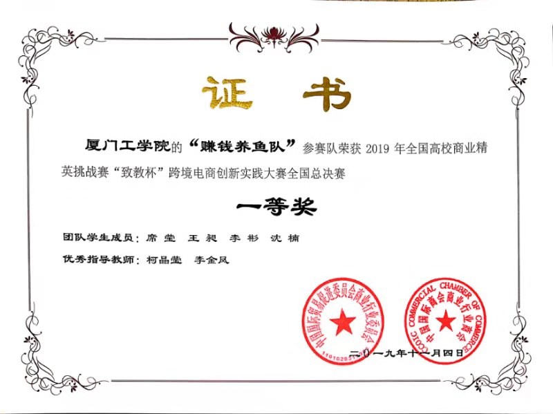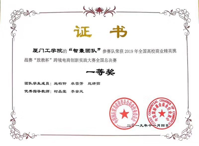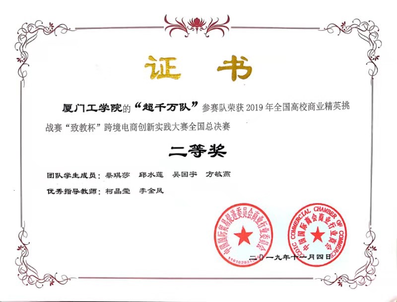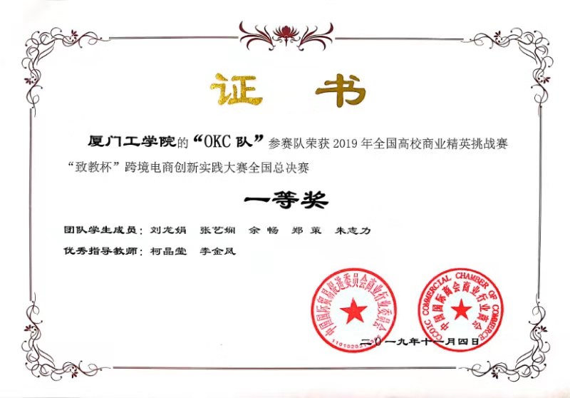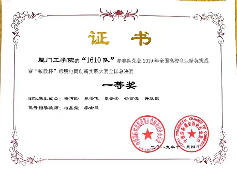 2019年10月12日-16日,全国高校商业精英挑战赛“致教杯”跨境电商创新实践大赛预选赛圆满落幕,厦门工学院商学院学生组建的5支队伍奋力拼搏,脱颖而出,全部入围全国总决赛。在总决赛中,4支队伍获得一等奖,1支队伍获得二等奖,其中,OKC队的比赛成绩位列全国总决赛第一名。OKC队、智囊团队、赚钱养鱼队作为进入全国排名前50的参赛队还将参加12月份在天津举办的全国精英赛,届时他们将进行跨境电商创新创业设计方案现场路演,预祝他们取得好成绩!