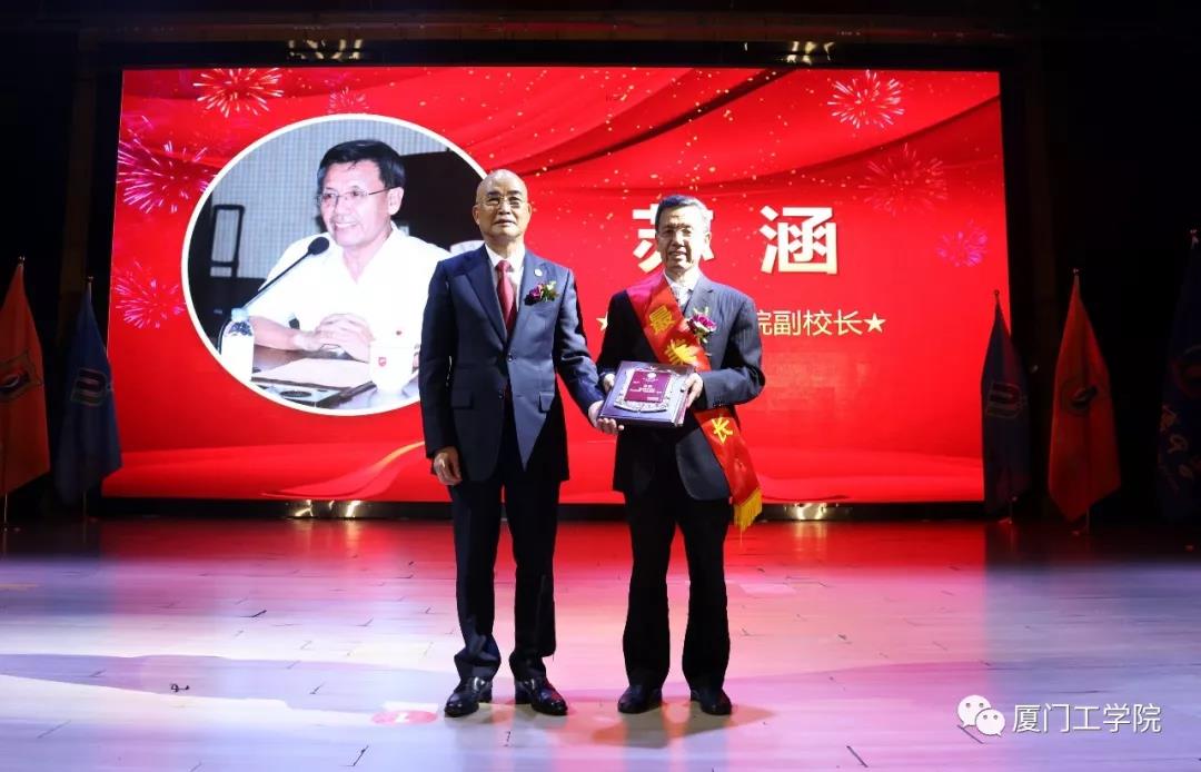 德文教育集团董事长、厦门工学院董事长李德文先生为“最美校长”厦门工学院副校长苏涵教授颁奖