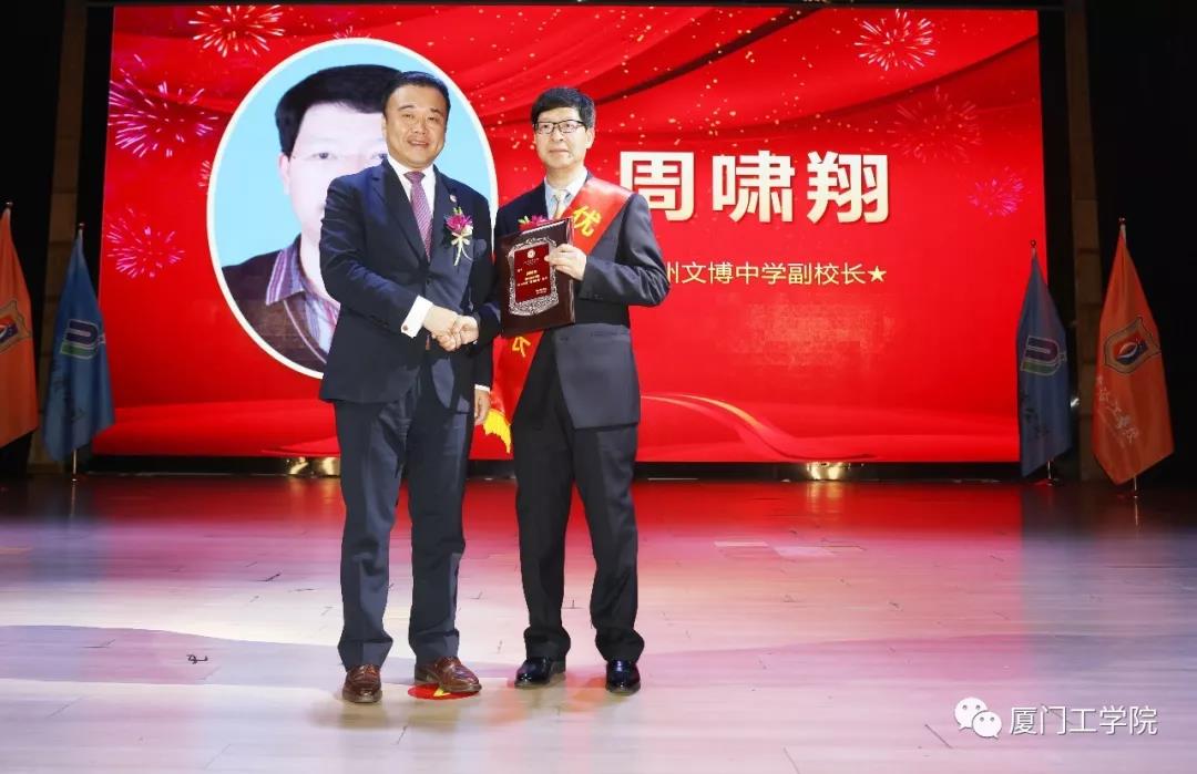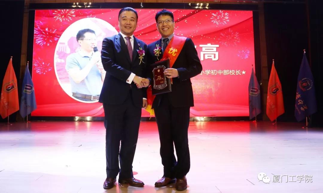 德文教育集团执行董事、总裁、厦门工学院副董事长李雄虎先生为“优秀校长”厦门工学院附属学校小学初中部校长周志高颁奖
