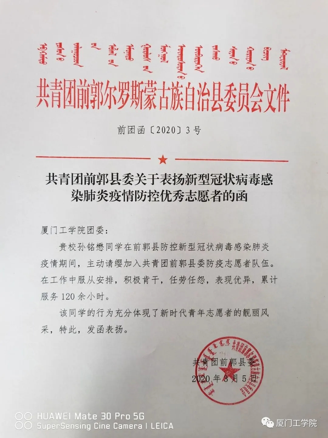 信中认为,新冠肺炎疫情爆发以来,孙铭懋同学主动请求参与一线志愿工作。他在各个社区参加人员信息核对、测温登记、社区管理、排查出入车辆、站岗执勤等工作,为前郭县城市管理执法局防疫工作贡献力量。
