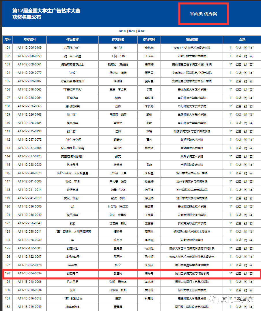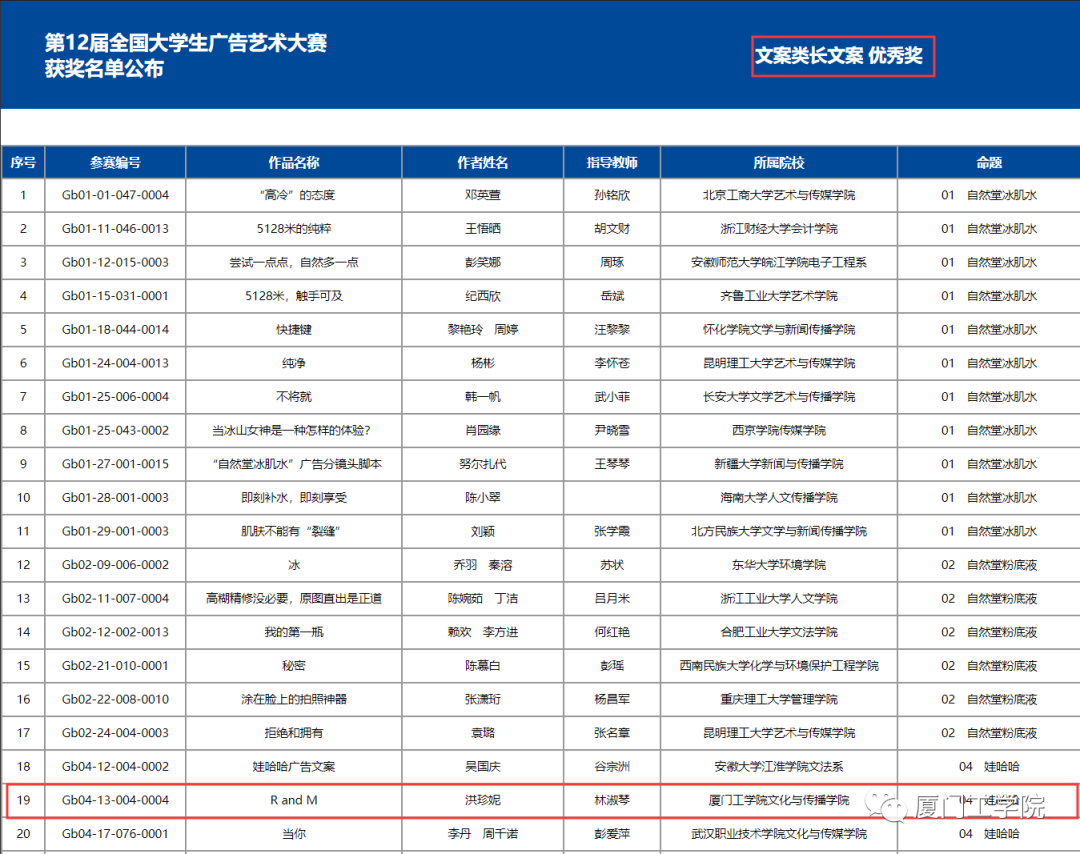 在9月15日正式公布的获奖名单中,我院邵孟宇老师指导的学生黎源松作品《手护》获得平面类二等奖、胡欣茹作品《便利你我生活》获得平面类优秀奖;朱丹青老师指导的学生贺瑞闻作品《战疫青年》获得平面类优秀奖;林淑琴老师指导的学生贺瑞闻作品《冰肌水》、洪珍妮的作品《R and M》、张芸霓的作品《杜蕾斯,让爱更安全》获得文案类优秀奖;王静王静老师指导的多人合作(郑林曦、陈红、马金岩、郑健鑫、杨子聪)作品《守护者》获得视频类微电影广告优秀奖。