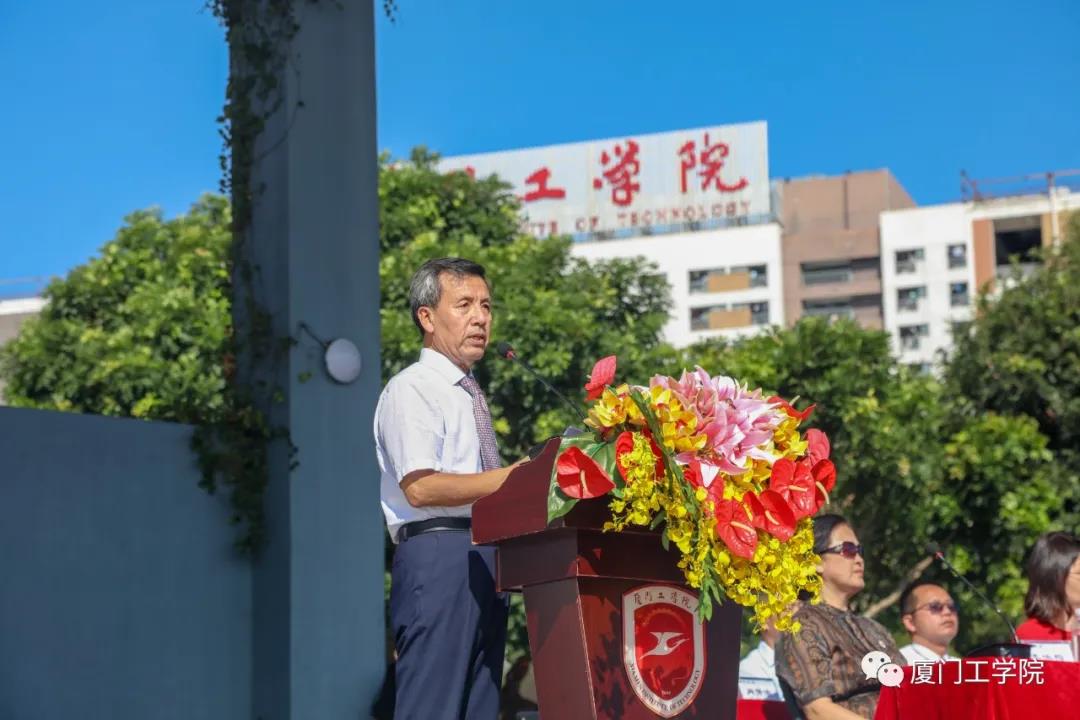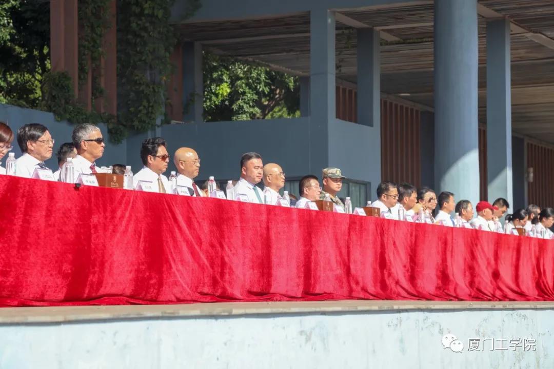 厦门工学院董事长李德文先生,党委林建华书记,副董事长李雄虎先生,副校长苏涵教授、冯良贵教授,李咏梅教授,集美区人民武装部傅其育副部长,金帝集团副总裁李福寿先生,各单位、二级学院负责人以及2020级全体新生一同参加了此次大会。