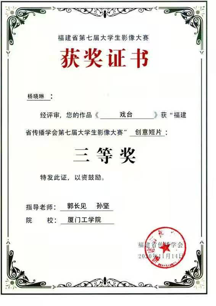 2020年11月13日至15日,福建省传播学会年会在福建技术师范学院召开。此次学术研讨会由福建省传播学会和福建省高校人文社科研究基地“政法舆情治理研究中心”联合主办,福建技术师范学院文化传媒与法律学院、非遗数字化与多源信息融合福建省高校工程研究中心联合承办。期间揭晓了第七届福建省大学生影像大赛获奖作品,厦门工学院艺术与传媒学院师生荣获13项奖项,其中5项二等奖、8项三等奖。