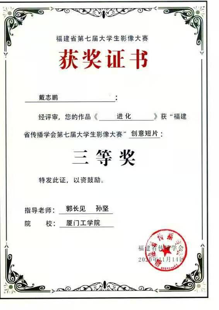 创意短片 | 进化 | 戴志鹏 | 郭长见、孙坚 | 厦门工学院 | 三等奖 |