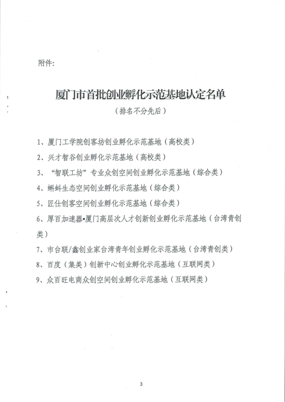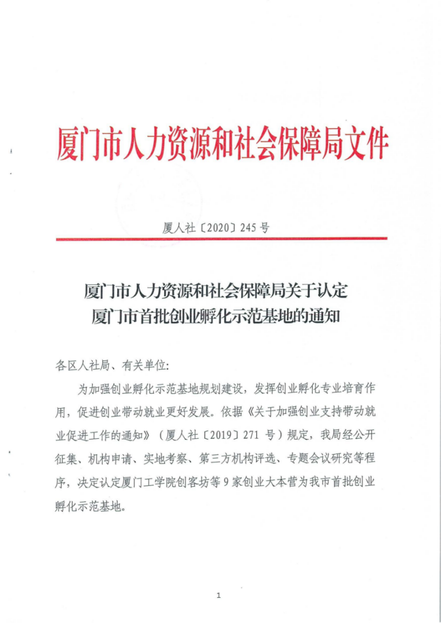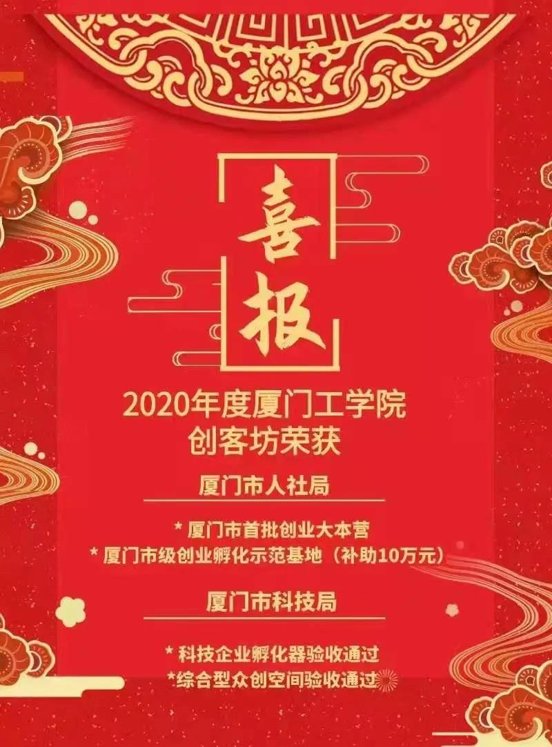 根据《关于加强创业支持带动就业促进工作的通知》(厦人社〔2019〕271号),经公开征集、机构申请、考察评选、会议研究,择优评出厦门工学院创客坊等9家创业大本营为厦门市首批创业孵化示范基地。