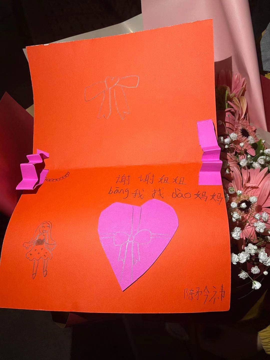 值得一提的是,这是一封特别的感谢信,是林女士的孩子亲手制作的。感谢信上稚嫩的笔迹写着“谢谢姐姐帮我找到妈妈”,短短一句话虽还夹杂着拼音写成,却能道出小朋友由衷的感谢,十分有心。