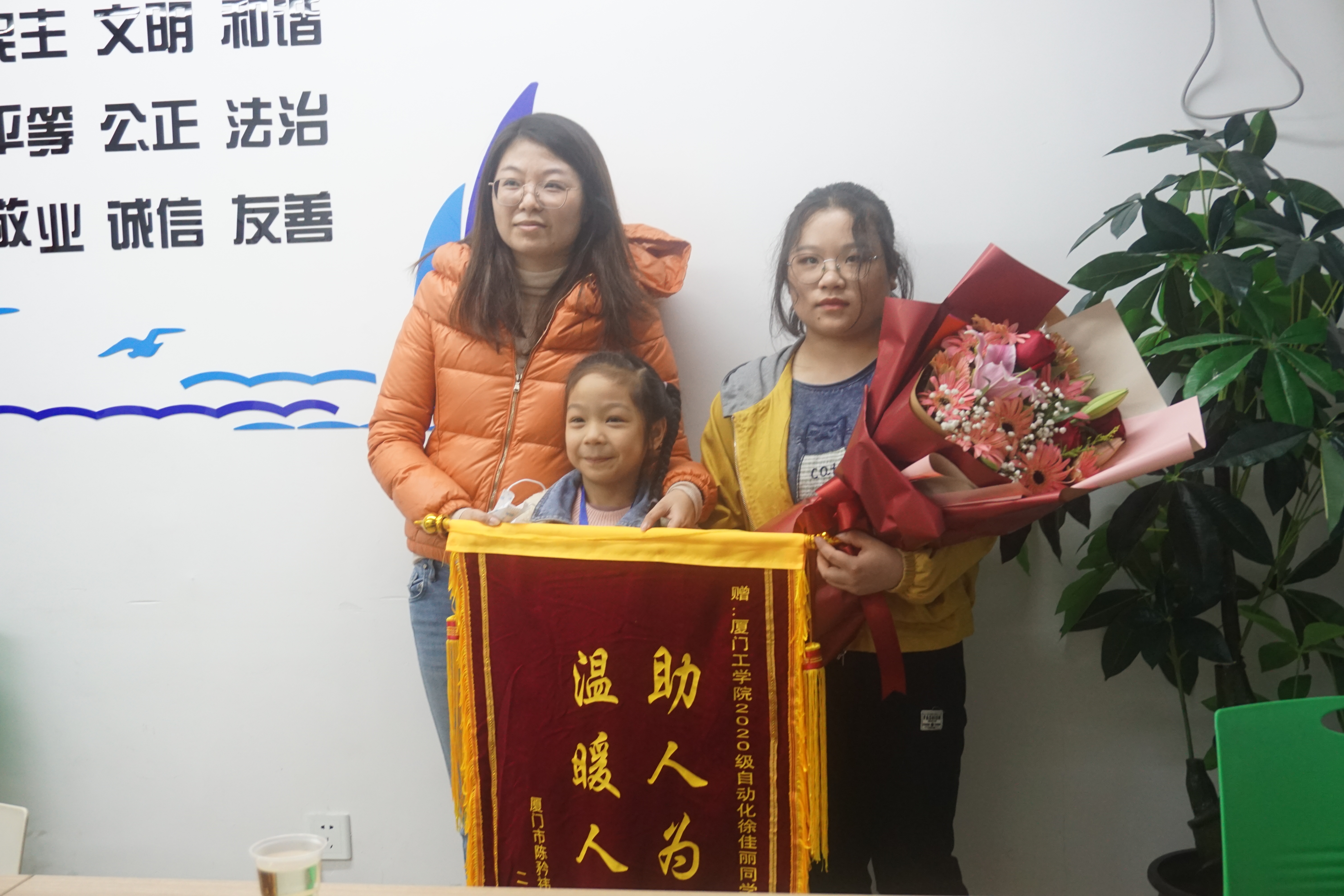 2021年1月5号傍晚,家住厦门的林女士带着孩子向友恭书院2020级自动化专业2班的徐佳丽送来了鲜花、锦旗和感谢信。当天恰值小寒节气,在友恭书院145活动室中,一个乐于助人的温暖故事方才娓娓道来。原来,在我校学生徐佳丽同学的热心帮助下,一名走失的7岁小女孩顺利地回到父母的身边。
