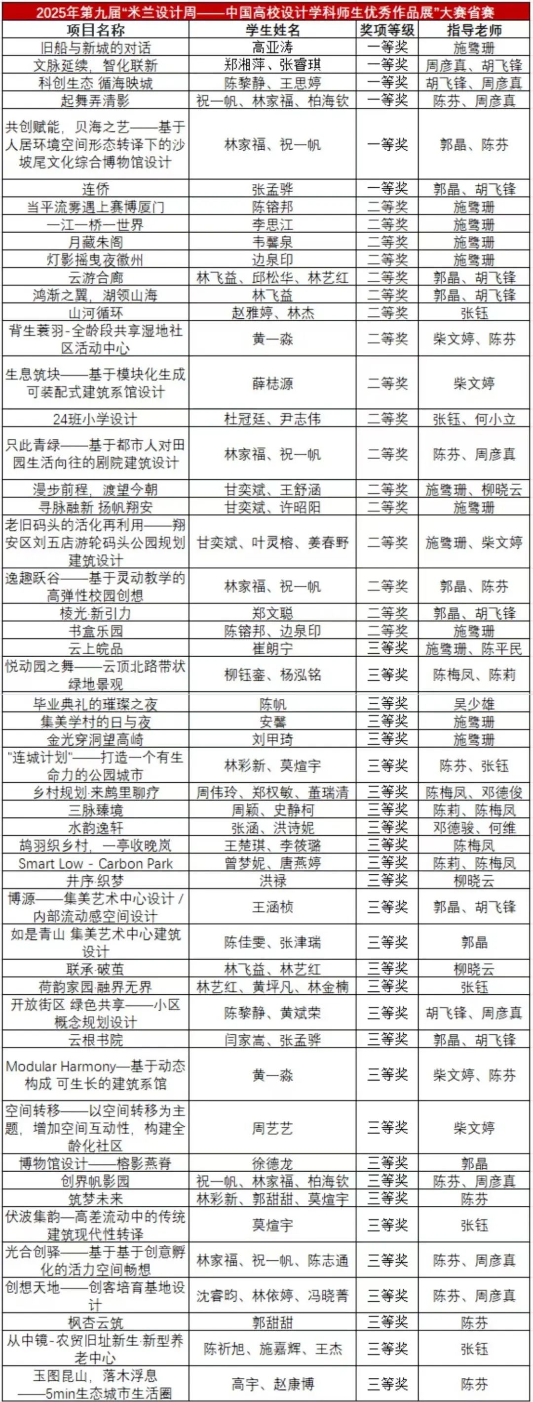 在2025年第九届“米兰设计周——中国高校设计学科师生优秀作品展”大赛省赛中,我校建筑科学与土木工程学院师生获一等奖6项、二等奖17项、三等奖29项。省赛获奖作品将进入全国总决赛评审。具体名单如下: