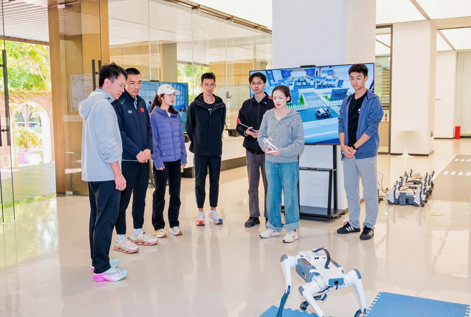 赛前,精英跑者团队走进学校多个产业学院实地参观,从体育产业学院出发,依次走访智慧建筑与建造、人工智能、工业智造、数字经济、跨境电商、数智传媒、鸿蒙智能物联等教学实践平台。