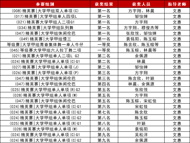 在2025年福建省大学生体育舞蹈锦标赛中,我校学子斩获8金3银2铜。我校荣获“优秀组织单位”“甲组团体总分一等奖”;文惠老师荣获“优秀教练员”;邹怡婵、方宇翔,张欣悦,袁铭阳,陈玉榕五位学生荣获“优秀运动员”。