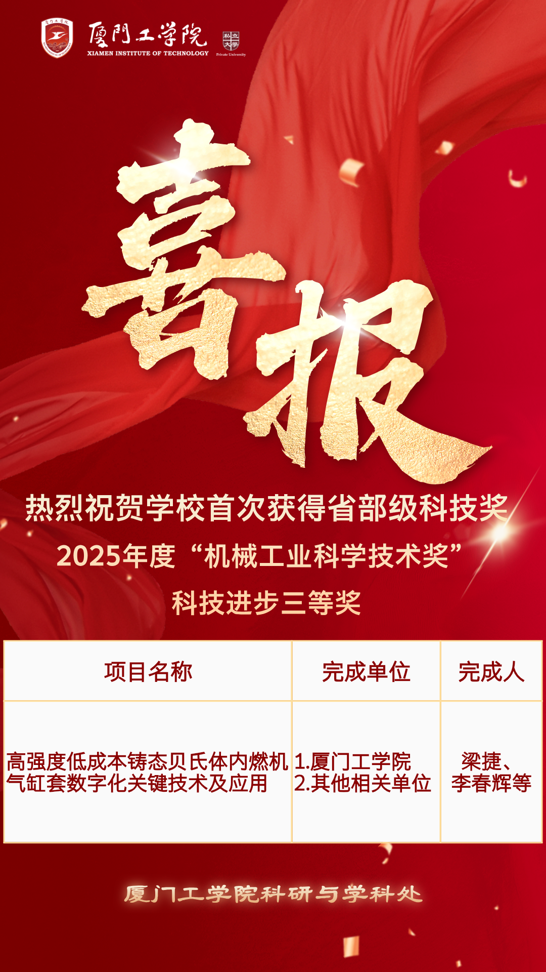 省部级科技奖斩获首金:首次获得“2025年度机械工业科学技术奖授奖项目科技进步奖”三等奖。这一高等级奖项的获得,实现了我校省部级科技奖“零突破”,是对项目团队高水平科研成果和解决关键技术问题能力的权威肯定,极大提振了全校科研人员的信心。