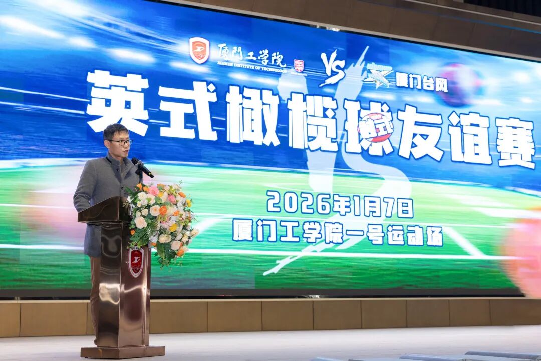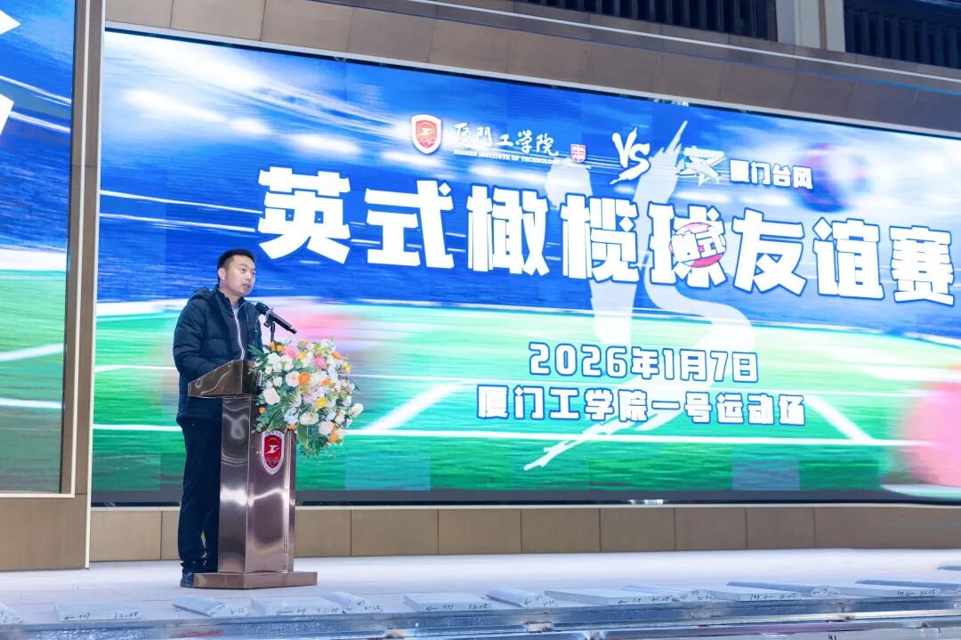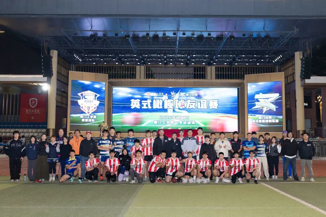 2026年1月7日晚,厦门工学院一号运动场内灯火通明、气氛热烈,“厦门工学院橄榄球队成立仪式暨英式橄榄球友谊赛”在此隆重举行,标志着学校橄榄球队的正式成立,也为校园特色体育文化建设开启了崭新一页。苏涵校长,李雄虎副董事长、执行校长,厦门市橄榄球协会会长刘戈等共同见证了这一历史性时刻。
