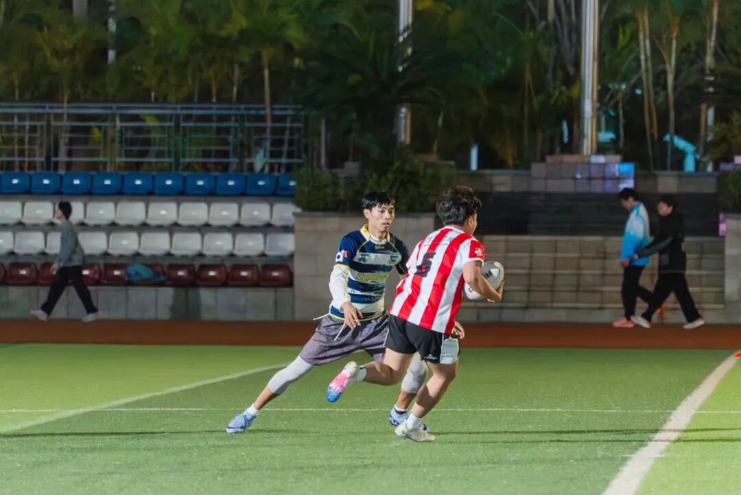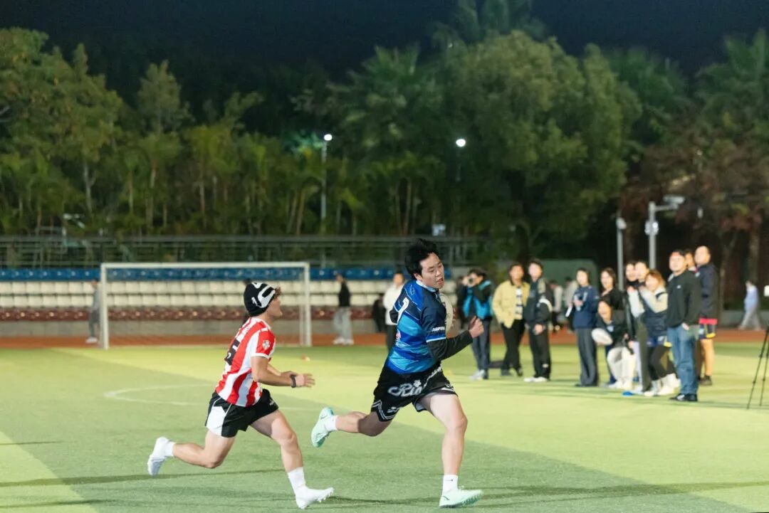 展示环节结束,友谊赛正式打响。厦门工学院橄榄球队迎战厦门台风英式橄榄球俱乐部队。比赛中,双方队员拼抢积极、攻防有序。厦门工学院队虽为新军,在战术执行与经验方面仍有提升空间,但全队敢打敢拼、每球必争,展现了顽强拼搏的体育精神。整场比赛节奏紧凑、对抗激烈,不仅为球队提供了宝贵的实战锻炼机会,也让现场师生近距离感受到英式橄榄球运动的独特魅力。