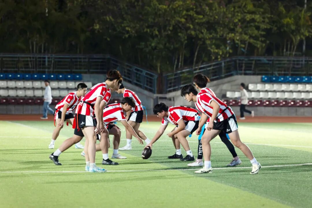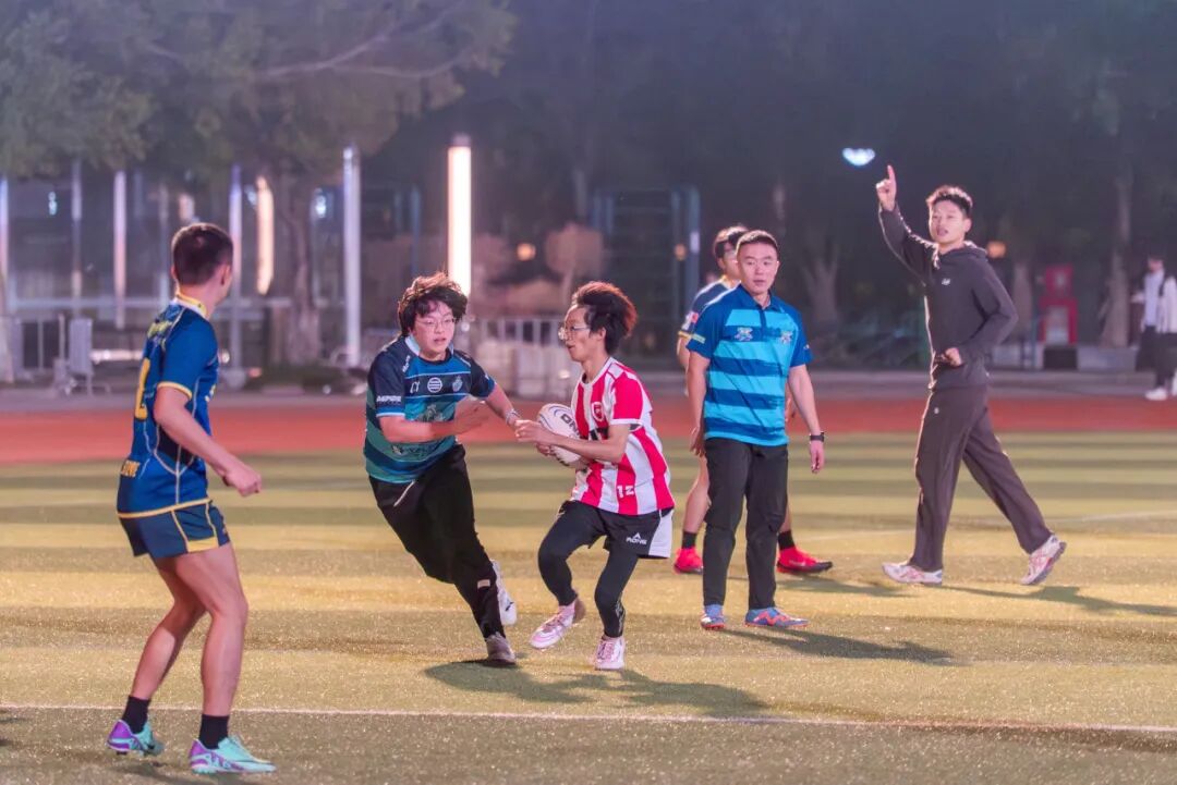 授旗仪式后,新成立的橄榄球队进行了训练成果展示。队员们通过传球、对抗、阵型跑动等一系列动作,展现出良好的基本功与团队默契,生动诠释了前期训练的扎实成效与队伍的昂扬朝气,赢得现场阵阵喝彩。