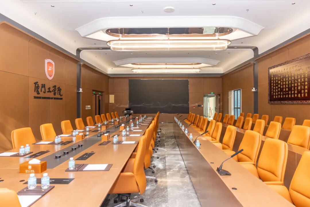 启贤会议室:图书馆一层的启贤会议室,通过大型会议长桌与橙色皮质座椅的搭配,营造出既庄重又充满活力的氛围。专业的会议设备与定制化的细节服务,确保了各类重要会议的高效与周到。暖棕色木饰面与浅灰色地面的色彩组合,在沉稳中透出现代感,成为一个鼓励思想迸发的协作空间。