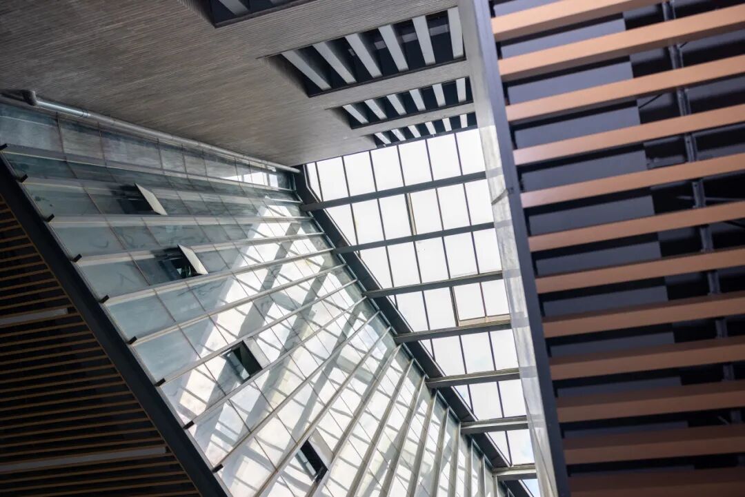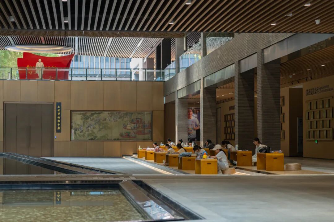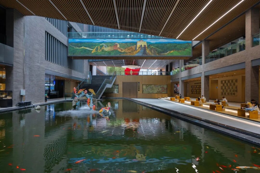 大厅中央,一池碧水如鉴,泉水喷扬;一池锦鳞成群,游弋嬉戏。“倏忽龙腾锦浪,悠然云起青渊”,澄澈的水景映照出“鲤鱼跃龙门”的灵动。抬首望去,通透的玻璃护栏与连接上下的开阔楼梯共同构筑了一个开阔通透、灵活多元的公共区域。这里不仅是知识的通道,更是凝神静思、交流互动的场所。