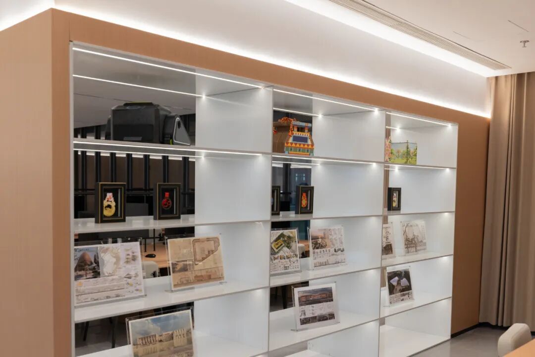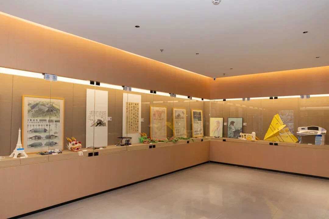 精品藏馆:图书馆三层的明博阁是一个静谧而庄重的展示空间,精选各学院的优秀成果,从科研发明到艺术创作,全方位呈现同学们的才华。现代而简洁的设计风格,让每一件展品都成为焦点。空间内陈列区与收藏区规划合理,不仅便于来宾参观,也能对作品进行精细化管理。于方寸画布间可见山河壮阔,在精微模型中能窥未来蓝图。这里不仅是呈现学校教学成果的窗口,更是学子们交流思想、启航未来的起点。