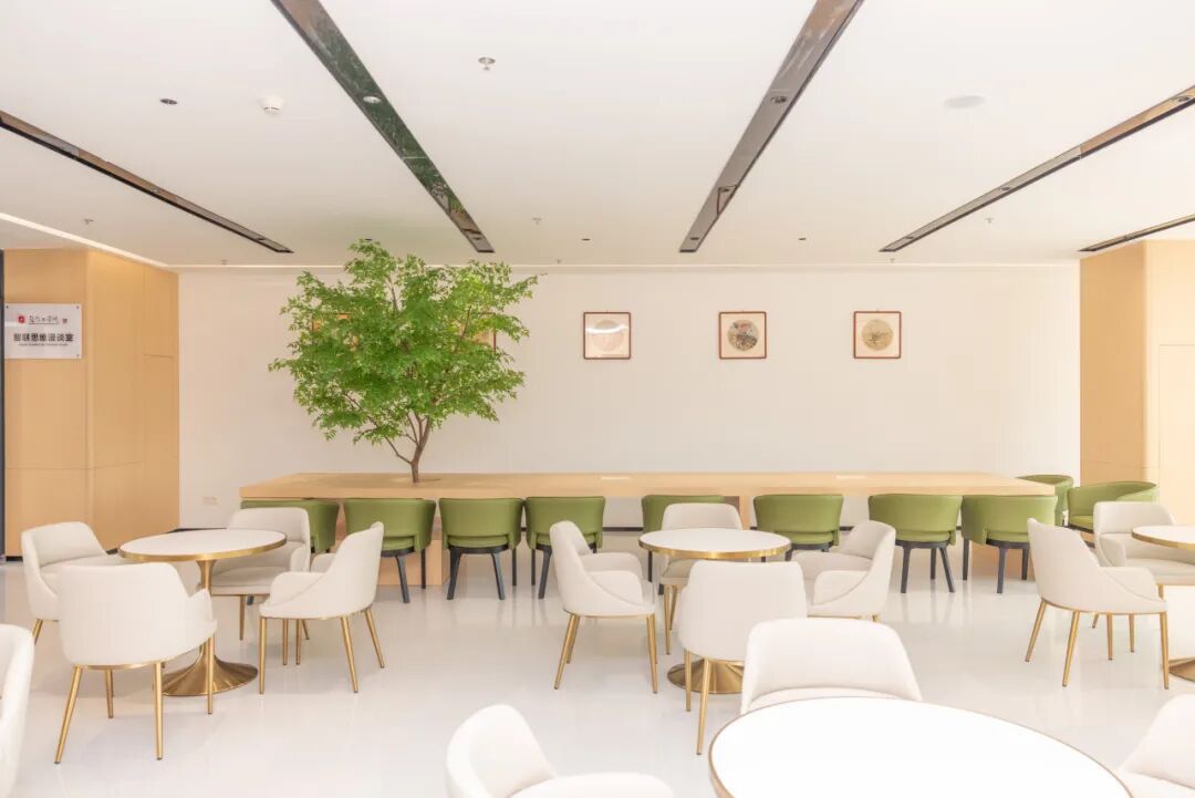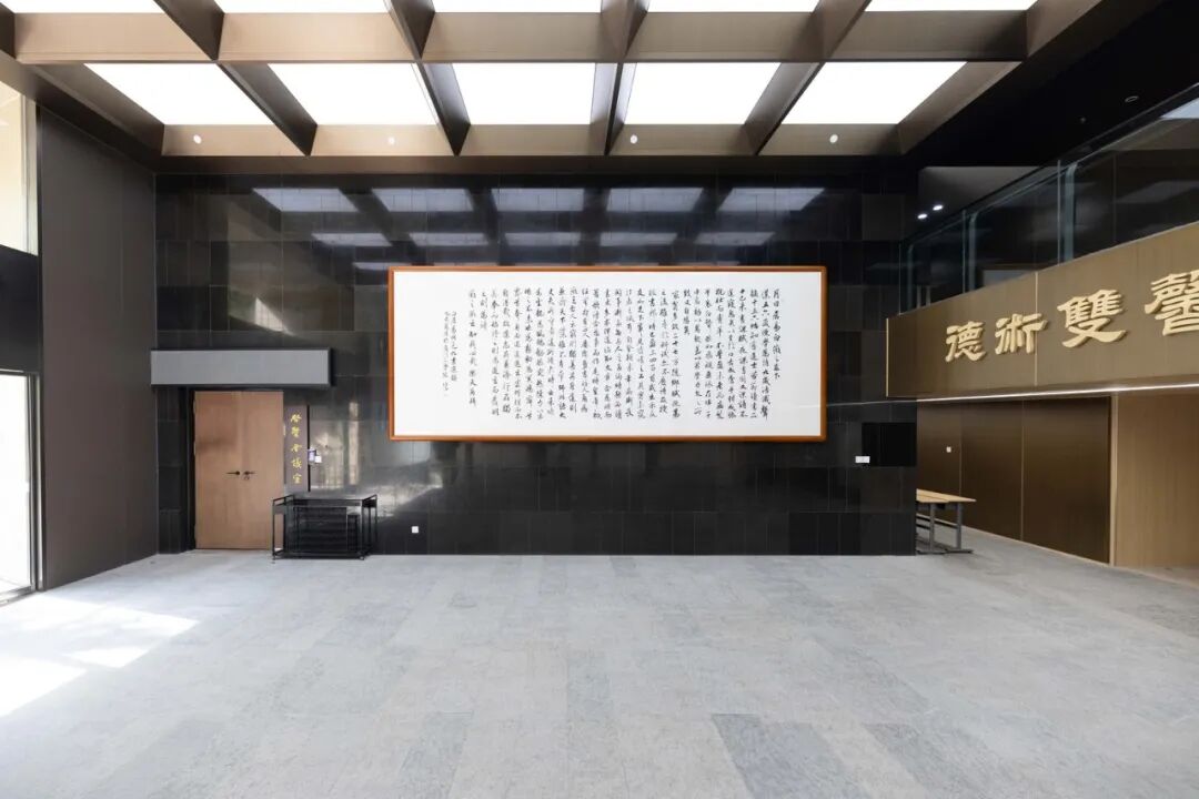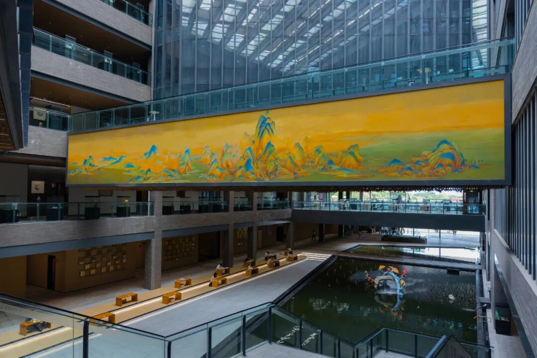 山水入画,意境栖心,步入大厅,一幅巨幅山水顷刻攫取视线,其作以金碧青绿之色,绘就层峦叠嶂的壮阔意境——山,寓意学术的沉稳与积淀;水,象征智慧的流转与创新,山水相融,顷刻间便为整个空间注入了悠远深厚的人文气息。