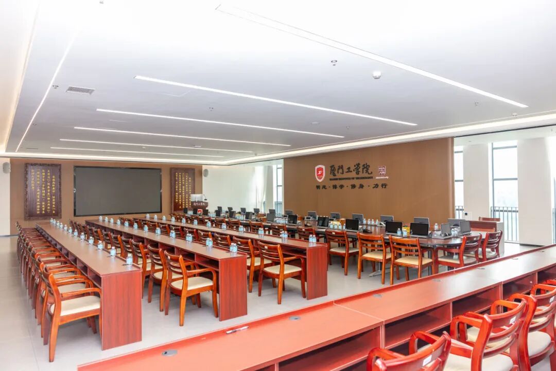 “广新堂”会议室:位于图书馆三层的“广新堂”会议室,体现了高效与人文的平衡。利旧改造的木质桌椅,在节约资源的同时延续了空间的温暖质感。主背景墙配备大型LED屏幕,确保多媒体演示的流畅进行。清晰的动线规划与舒适的灯光环境,让每一次会议、每一场学术研讨都能在专注、顺畅的氛围中展开。