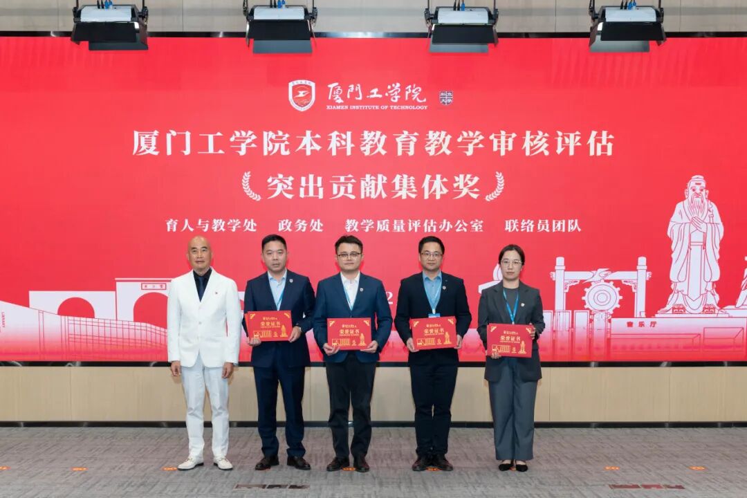 苏涵校长,校党委朱瑞元书记,李雄虎副董事长、执行校长,李咏梅副校长,李文副校长颁发“厦门工学院本科教育教学审核评估突出贡献奖”。