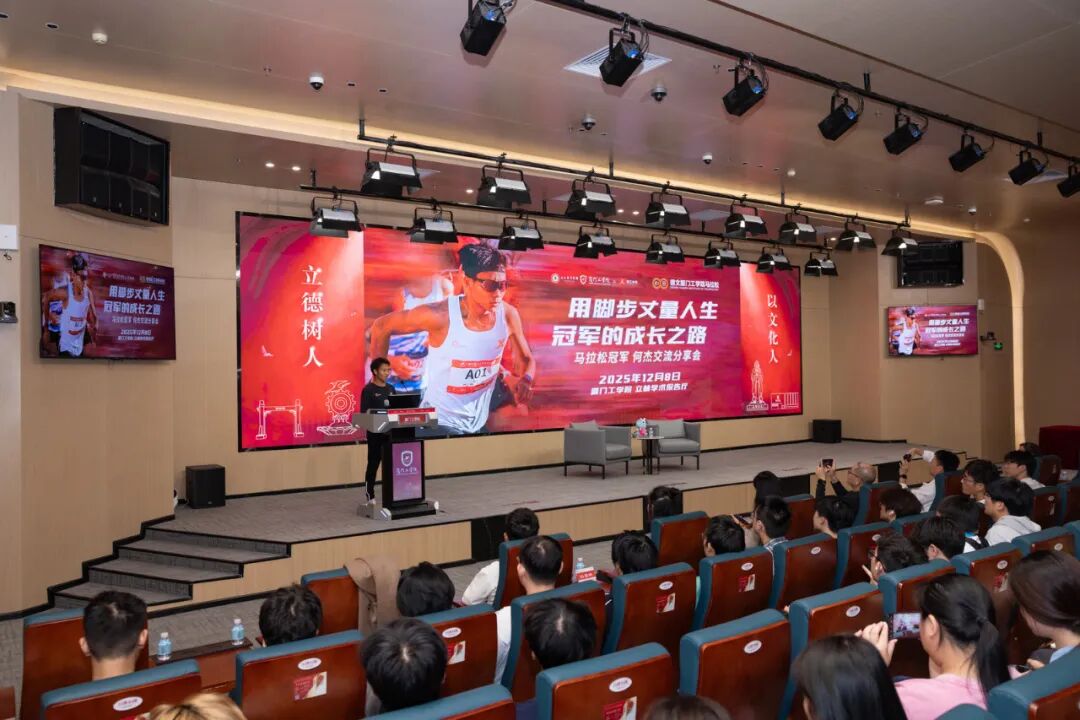 在此前的分享中,何杰讲述了他的成长经历与心路历程。他回顾了从省队到国家队的奋斗过程,以“重复训练,专注投入”诠释体育精神,坦言曾历经低谷,却始终坚韧前行。他鼓励同学们“敢于梦想,不畏起步”,在坚持中积累自信与成长——这不仅是一位冠军的奔跑哲学,更与厦门工学院通过体育塑造人格、锤炼意志的教育追求深深共鸣。