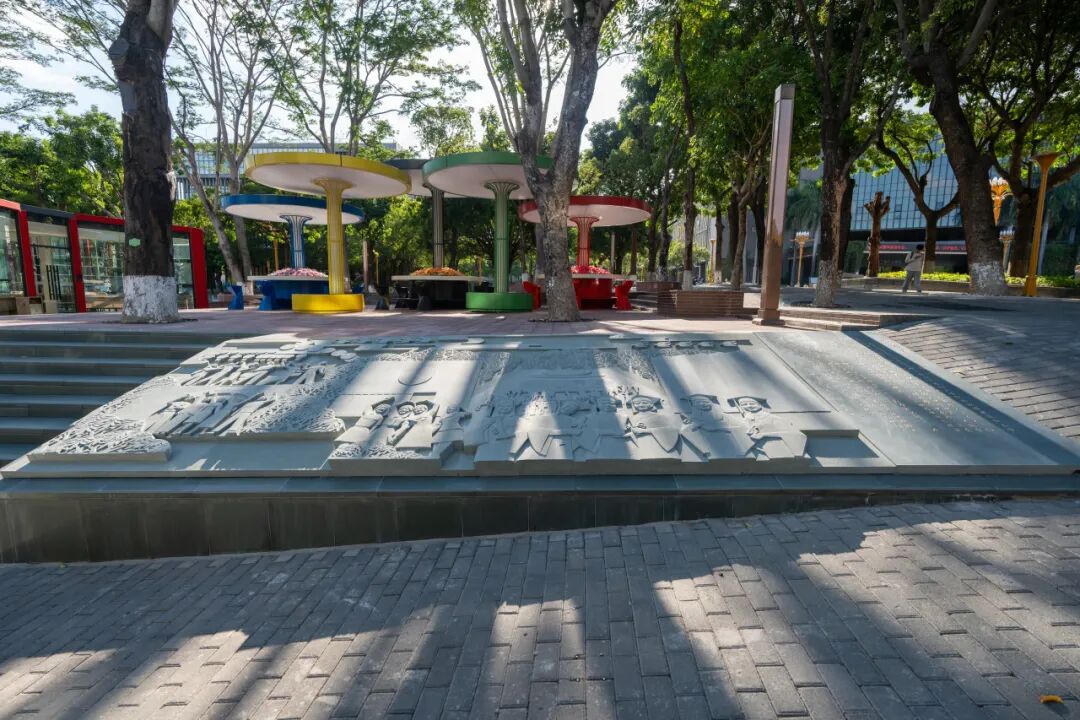 长卷起笔,学校一号门前景致巍然舒展。校徽高悬,校名石沉稳伫立,莲花音乐喷泉的雕琢栩栩如生,与前景学子们的青春身影相印照,让校园场景的写实感与 “殿堂” 的学府氛围,在石浮雕的光影里交相呼应——这不仅是校园的入口,更是精神成长的起点。