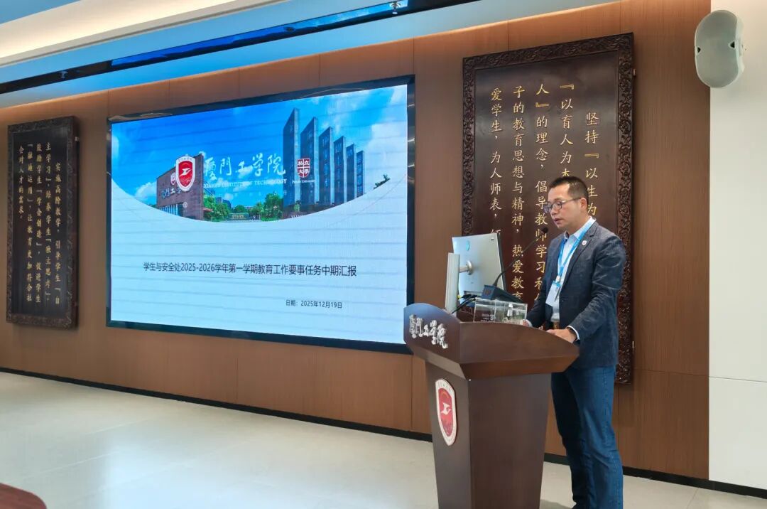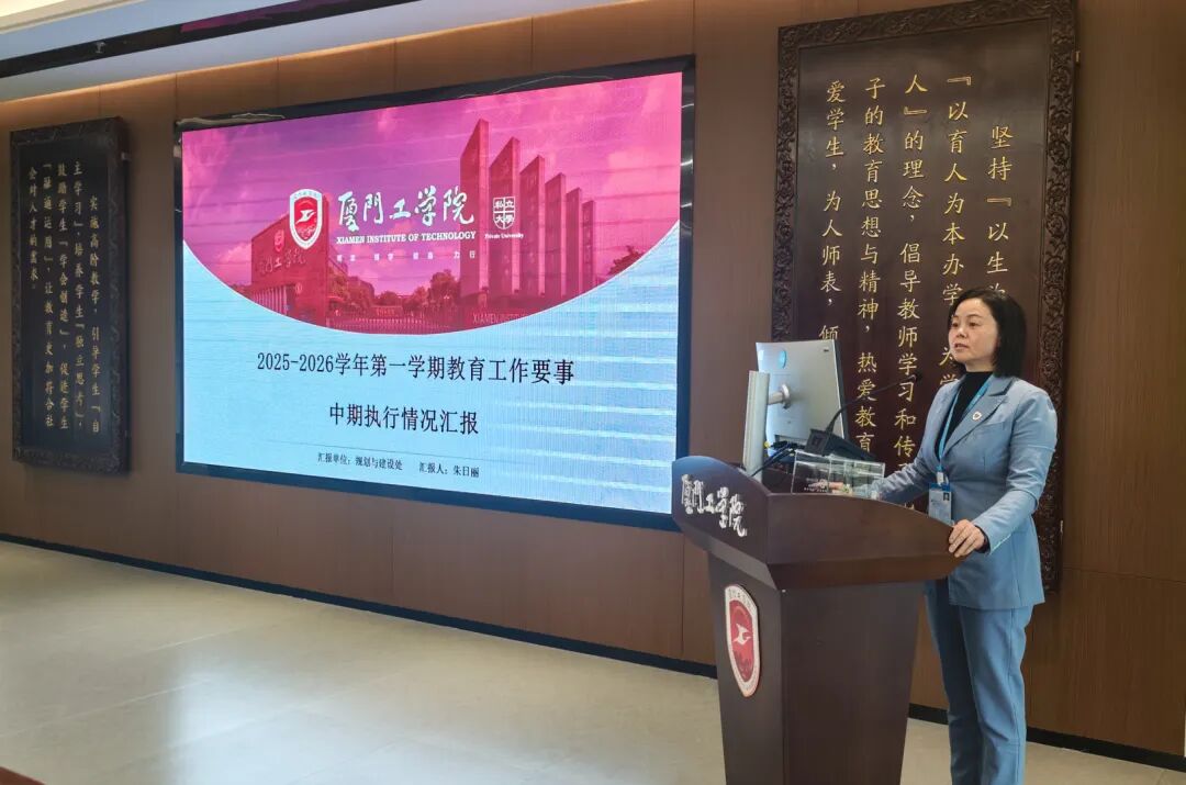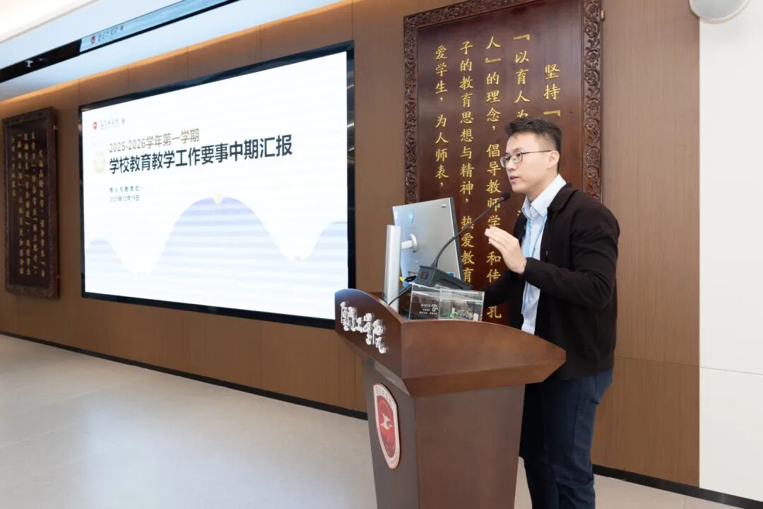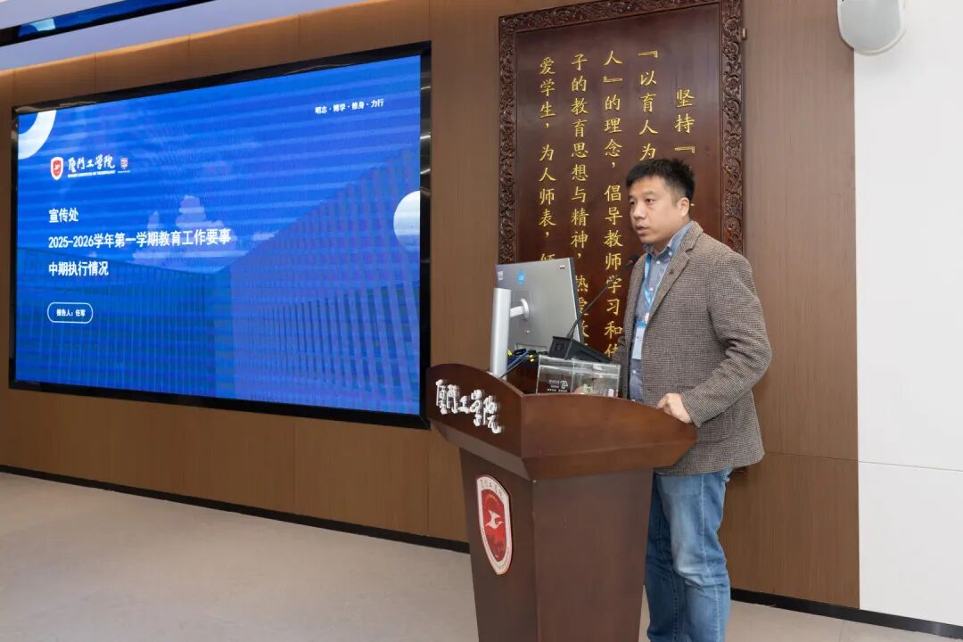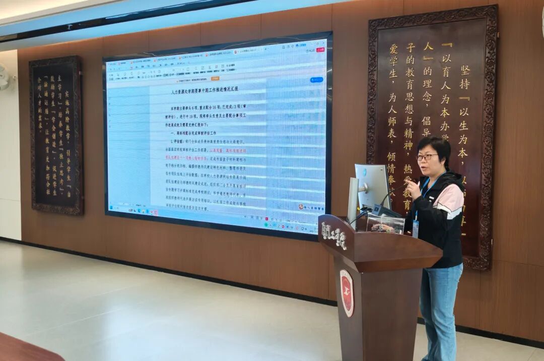 随后,学校要事执行办公室主任蓝素端汇报了本学期教育工作要事中期整体开展成效,深入剖析了目前执行过程中存在的任务分解精准度不足、跨部门沟通不畅等难点,并进一步明确要重视过程性、阶段性工作总结、加强校院两级沟通联动等具体要求。