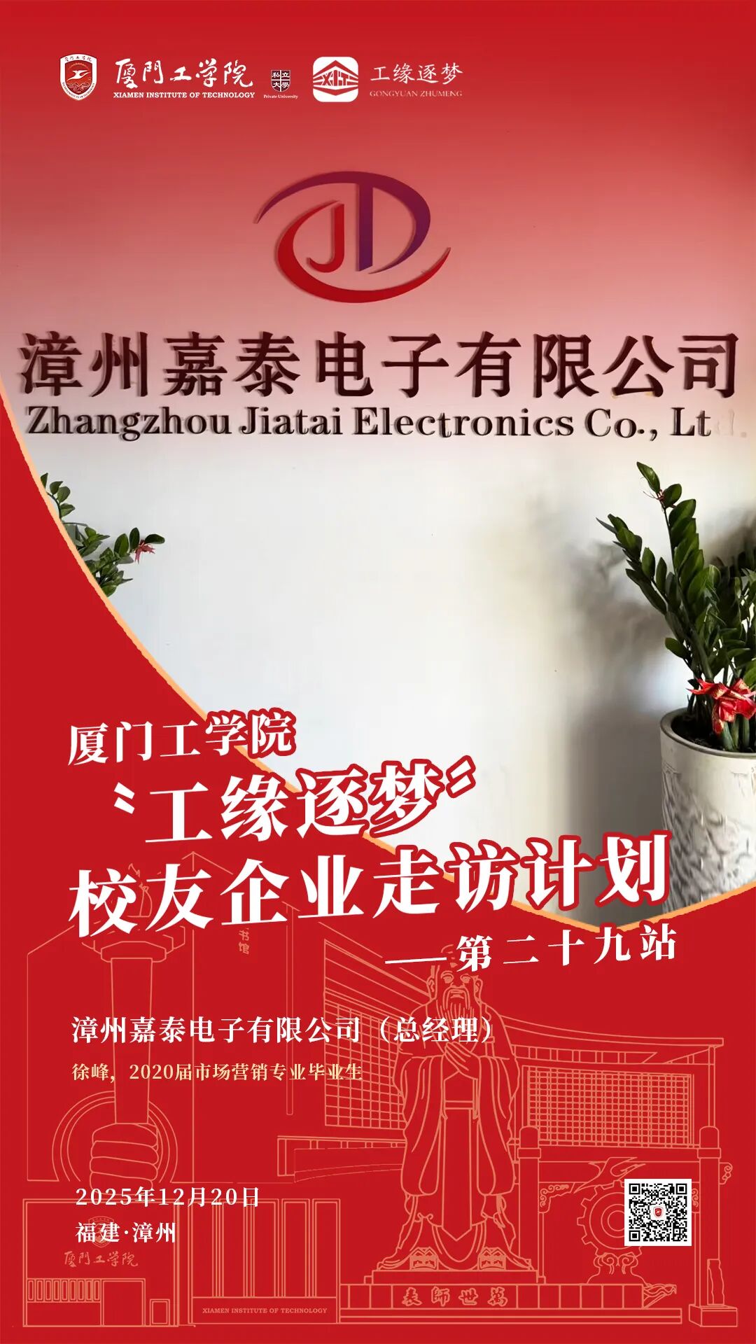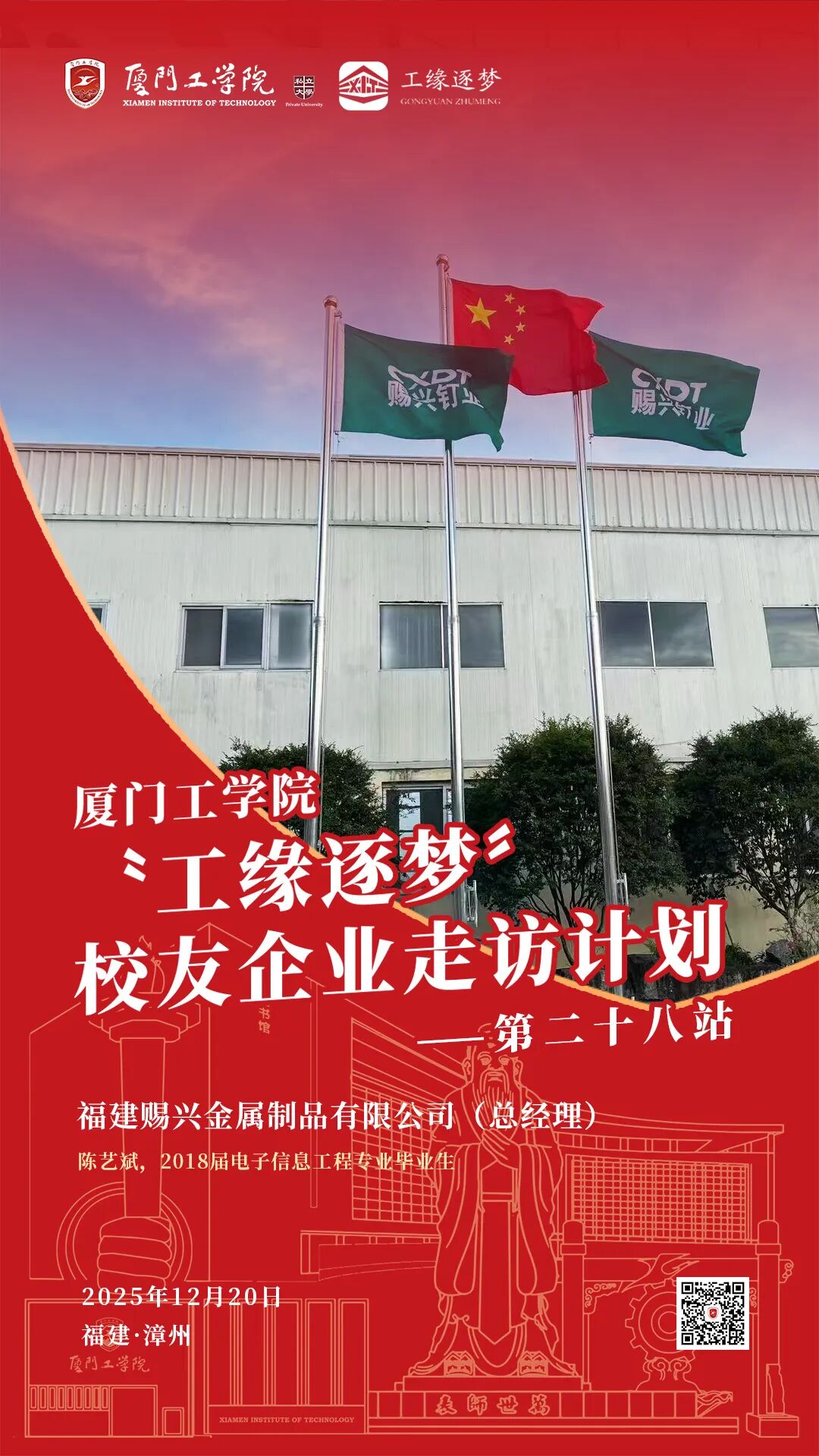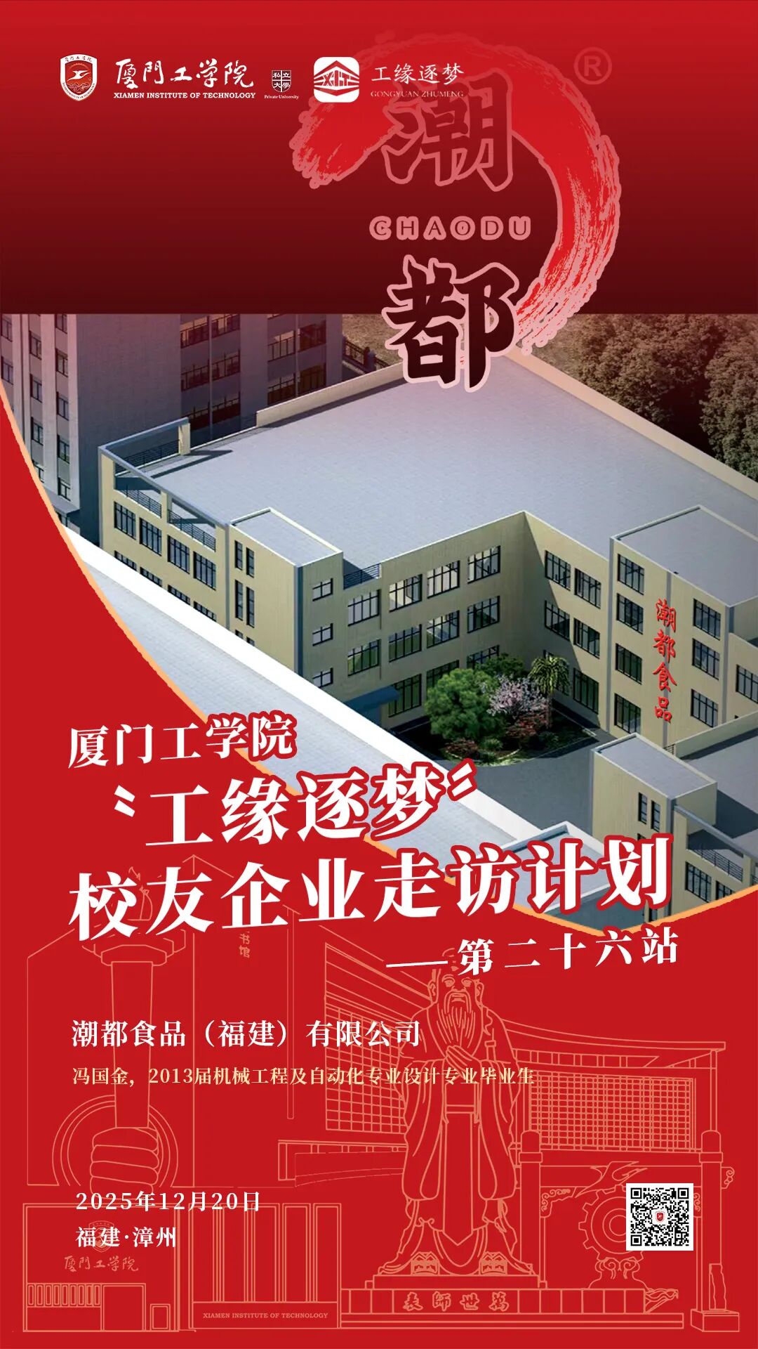 从食品赛道的匠心深耕到金融领域的稳健赋能,从金属制造的坚守创新到电子产业的科技突围,厦门工学院“工缘逐梦”校友企业走访计划第二十六、二十七、二十八、二十九站,于2025年12月20日在漳州圆满落幕。此次由厦门工学院副董事长、执行校长、校友总会会长李雄虎先生带队,相关学院领导、校友总会秘书处负责人一行组成的参访团,怀揣母校的牵挂与期许,先后走进潮都食品(福建)有限公司、福建龙海泰隆村镇银行海澄支行、福建赐兴金属制品有限公司、漳州嘉泰电子有限公司,在追忆青葱岁月中厚植校友情谊,在精准对接中拓宽合作赛道,让“终身服务校友、深度赋能产业”的宗旨落地生根,为产学研用深度融合注入澎湃动能。