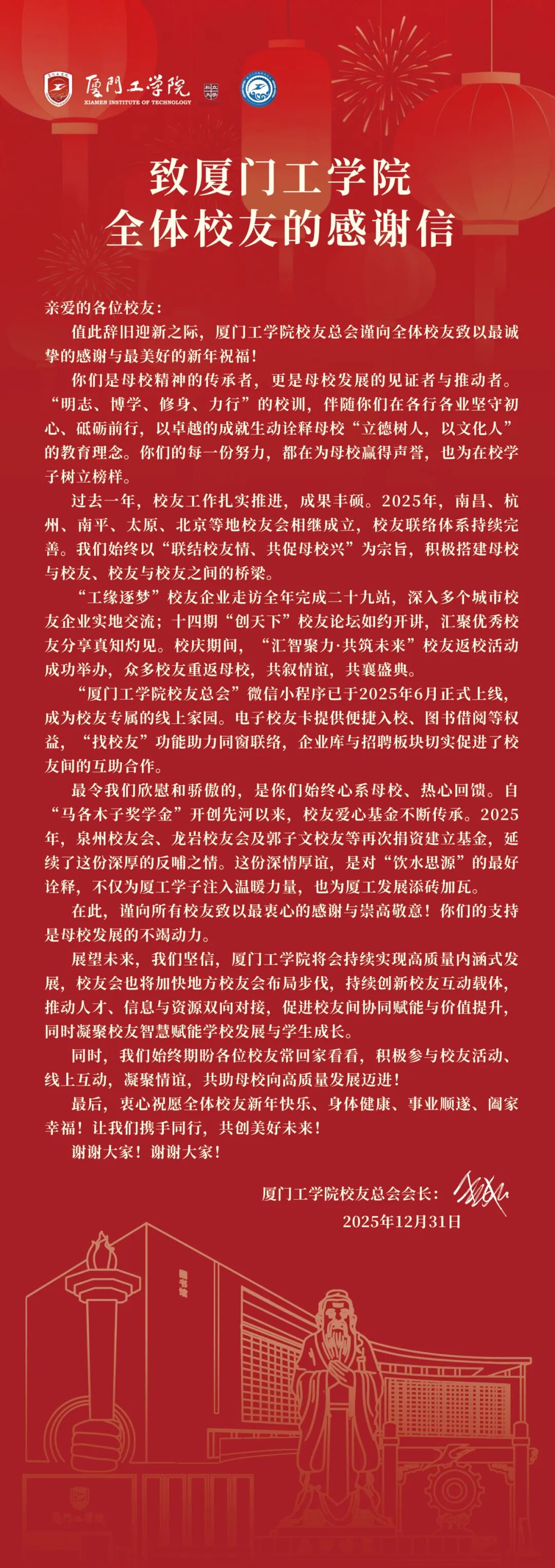 时光荏苒,值此辞旧迎新之际,厦门工学院李雄虎副董事长、执行校长、校友总会会长谨代表校友总会,向全体校友送上最诚挚的感谢与新年祝福,一封感谢信,道尽母校与校友间的深情联结。