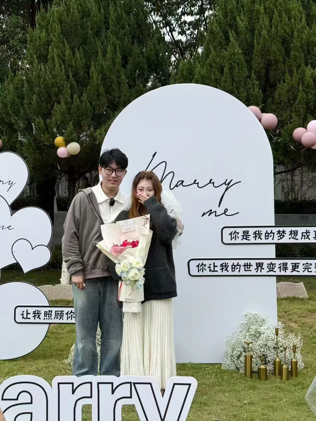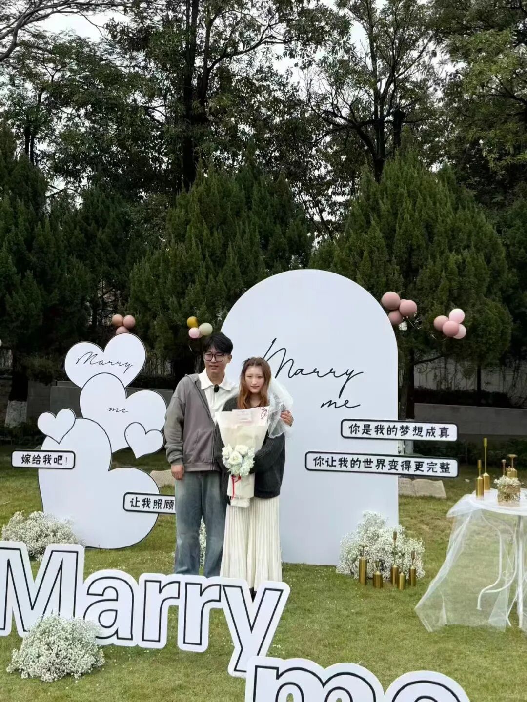 秦锦春学长:我们毕业后我就回到了山西,所以在厦门没什么熟人,筹备起来确实费了不少功夫。我先是联系了福州的学长,帮忙对接学校,之后自己在网上选物料、找策划公司,前后换了三四家,直到订婚前三天才终于敲定。那段时间,每晚都在琢磨细节,总想着怎样让这场惊喜更完美。